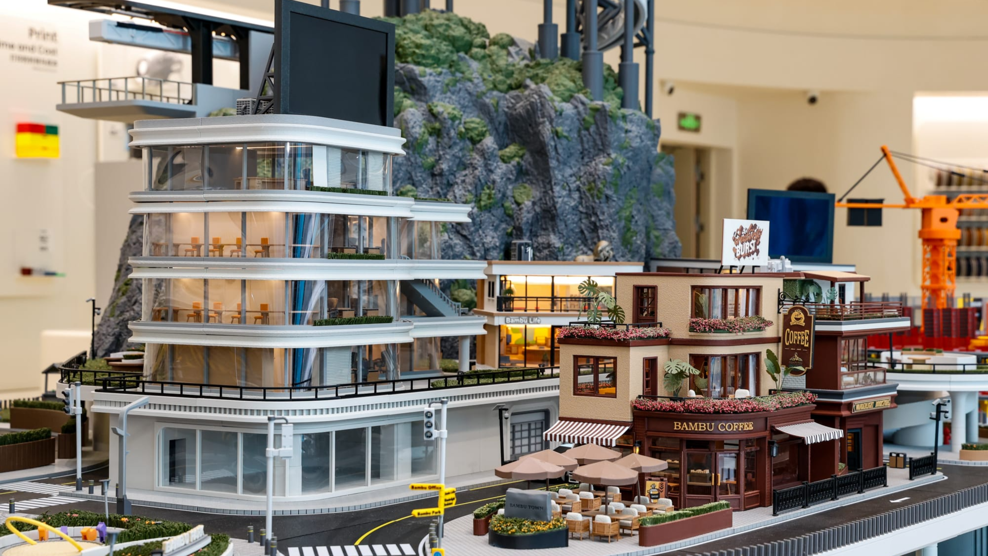 The most eye-catching elements include a giant sandbox showcasing different 3D printing scenarios, a wall of advanced printers working simultaneously, and a 3D printed train circling around the store’s ceiling.