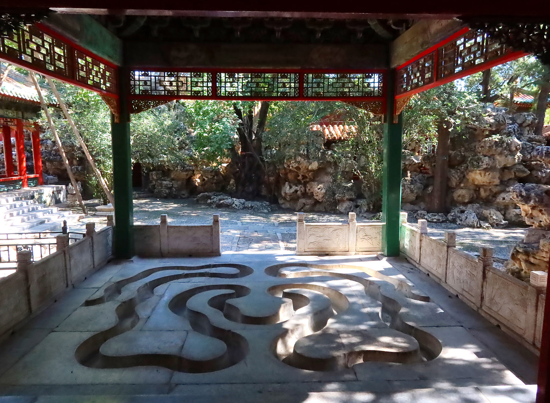 Artisans carved out stone-slab flooring to mimic streams where the ancient literati played a drinking game of floating cups along a serpentine stream, enjoying wine and composing poetry.