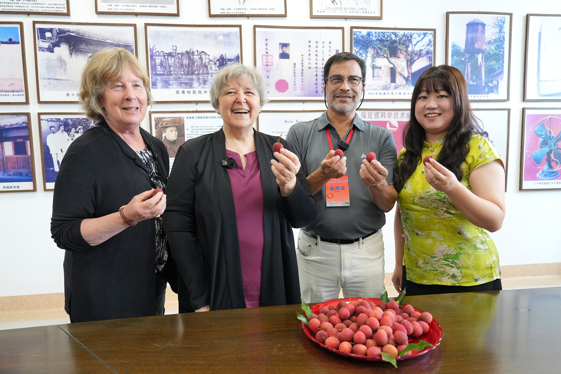 (From left) Martha Smalley, a special collections librarian of the Yale University Divinity Library, Elyn MacInnis, initiator of "Kuliang Friends", a group of descendants of American families who once resided in Kuliang, Fujian province, Thomas Hemenway and Huang Yao taste the lychee fruit planted by Ruth V. Hemenway in Fujian province, in July, 2025. (BAO HUA / FOR CHINA DAILY)