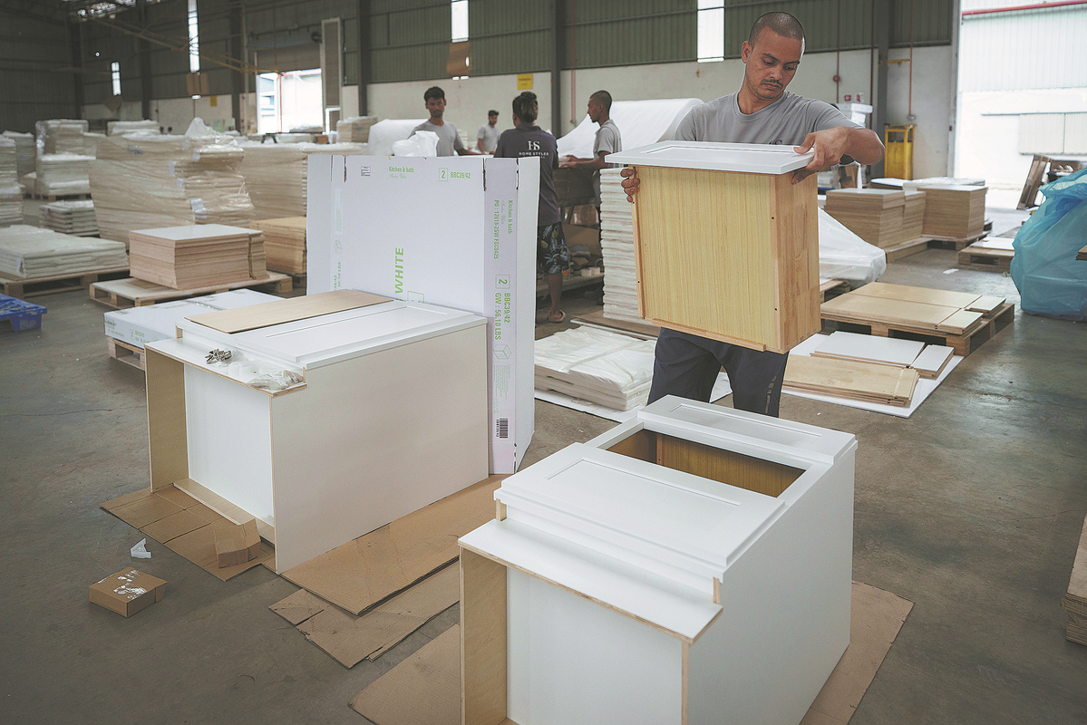 Workers pack furniture for shipping to the US at Corporate Specialist's factory on the outskirts of Muar, in Johor state, Malaysia, on April 11. (PHOTO / AP)