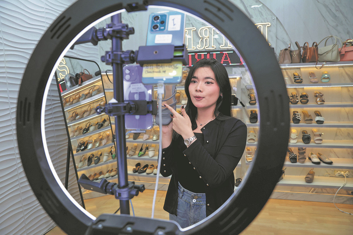 A woman holds a shoe as she livestreams from a women's shoes and bag factory in Bogor, Indonesia, on April 14. The shoe factory relies on the marketplace to sell its products to various countries, including the United States. (PHOTO / EPA-EFE)
