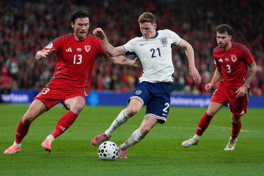 England's Elliot Anderson is challenged by Wales's Kieffer Moore (left) during an international friendly soccer match between England and Wales at Wembley stadium in London on Oct 9, 2025. (PHOTO / AP)