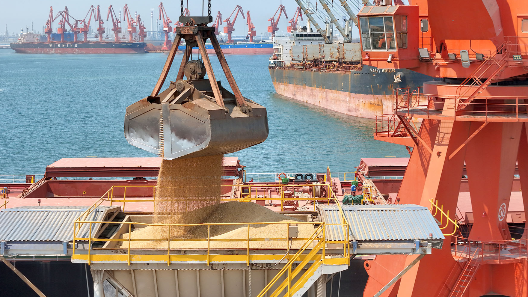 A grain bucket handles imported soybeans at Yantai port on June 17, 2025. (TANG KE / FOR CHINA DAILY)
