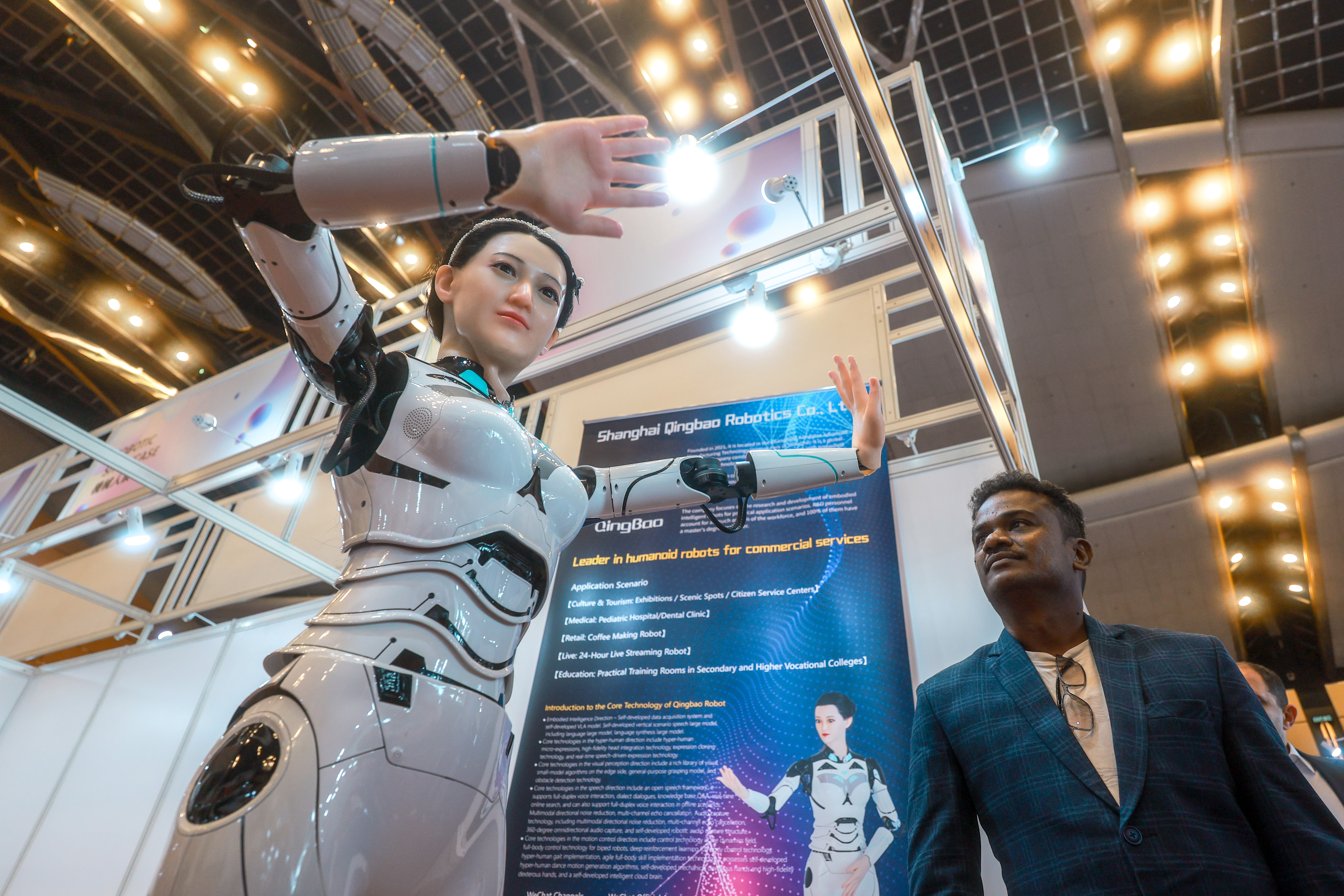 The demand for humanoid robots is increasingly high in overseas markets, and they could help fill gaps in elderly care and companionship in aging societies, Wang Lei, the company’s chairman and chief executive officer, said. Around 70 percent of potential clients Wang talked with on the opening morning of the trade fairs were from overseas, he added. Qingbao’s products are sold in seven markets, including Cambodia and South Korea, and Wang said he believes Hong Kong is a springboard for further growth in Southeast Asia.