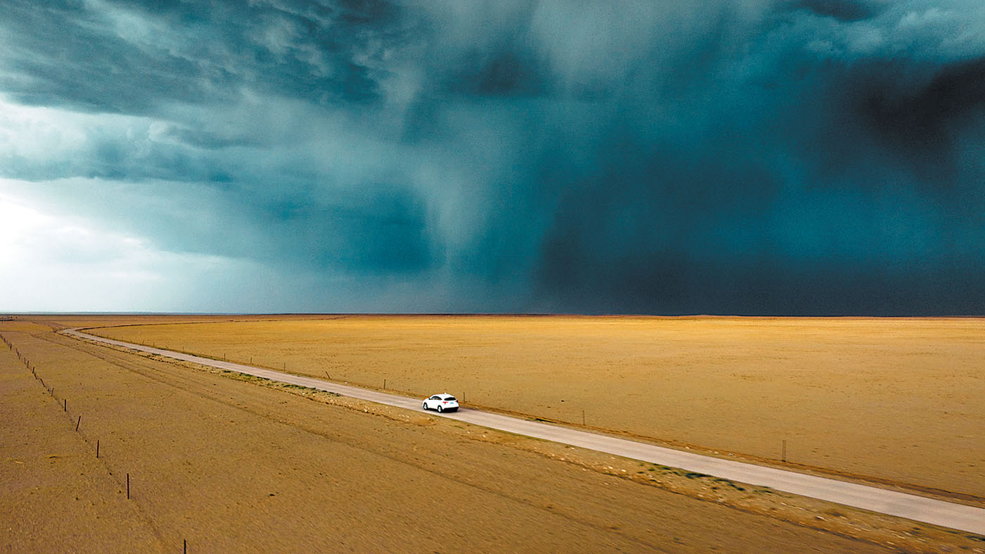 A scene shows a car driven by Su Dike, the film's director, and his team to chase a storm. (PROVIDED TO CHINA DAILY)
