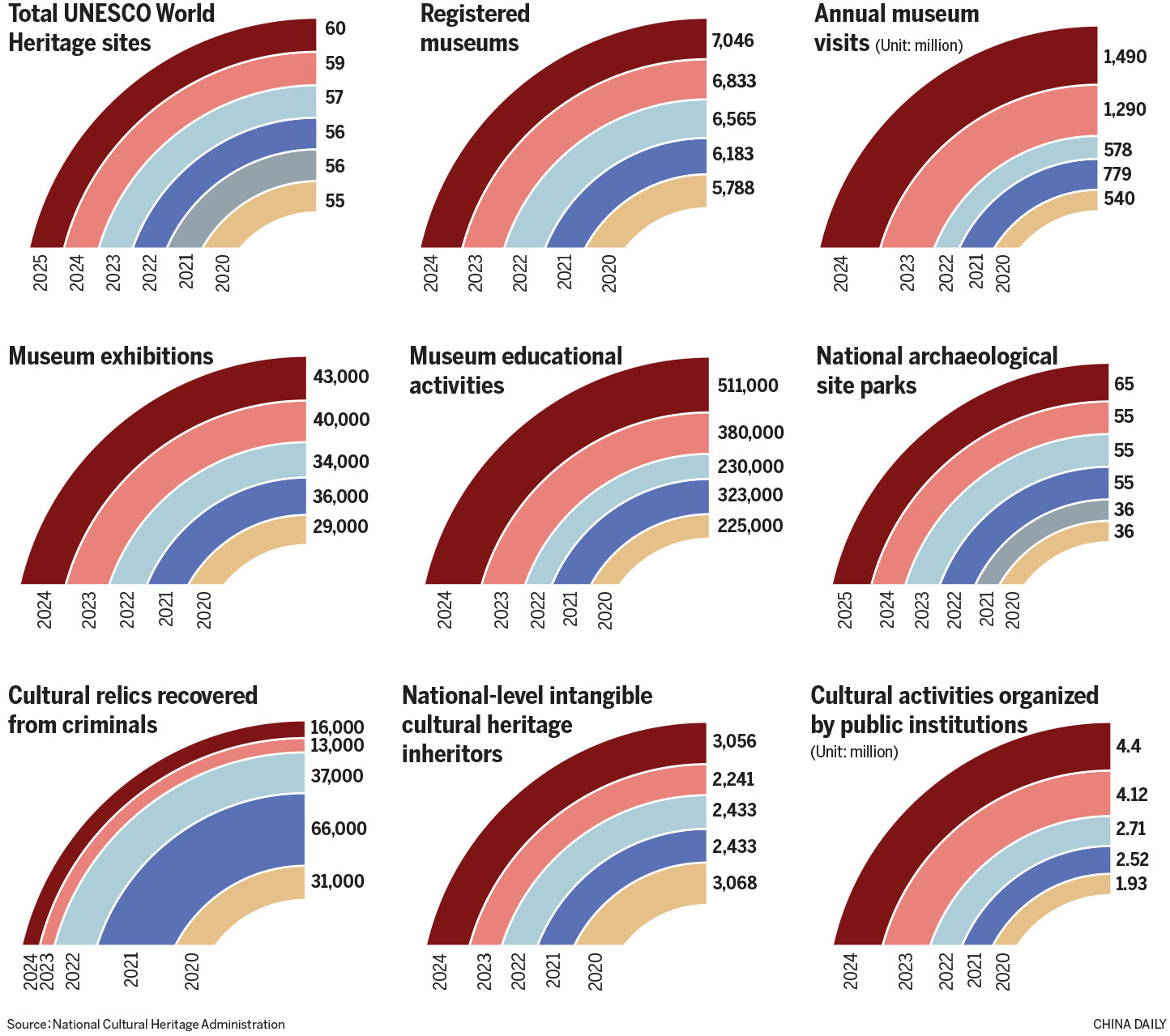 China had 7,046 registered museums as of the end of 2024, according to the National Cultural Heritage Administration, recorded nearly 1.5 billion visits in total, and held about 43,000 exhibitions last year.