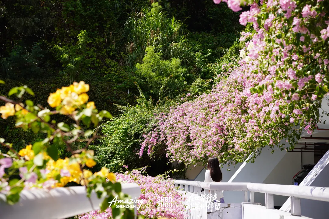 A particularly stunning display can be found at the parking lot entrance of the Xianhu Botanical Garden (仙湖植物园), where the bougainvillea cascades create a breathtaking sea of pink, white, and yellow flowers, giving the entire structure the look of a floral cruise ship.