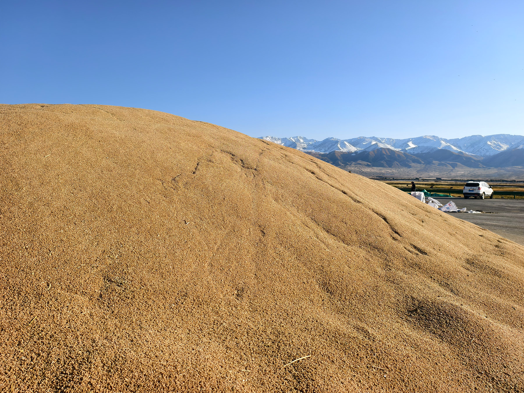 A heap of wheat is sun-dried at the Gaojia Lake Wetland in Barkol on Sept 23, 2025. (WANG JUNFENG / FOR CHINA DAILY)