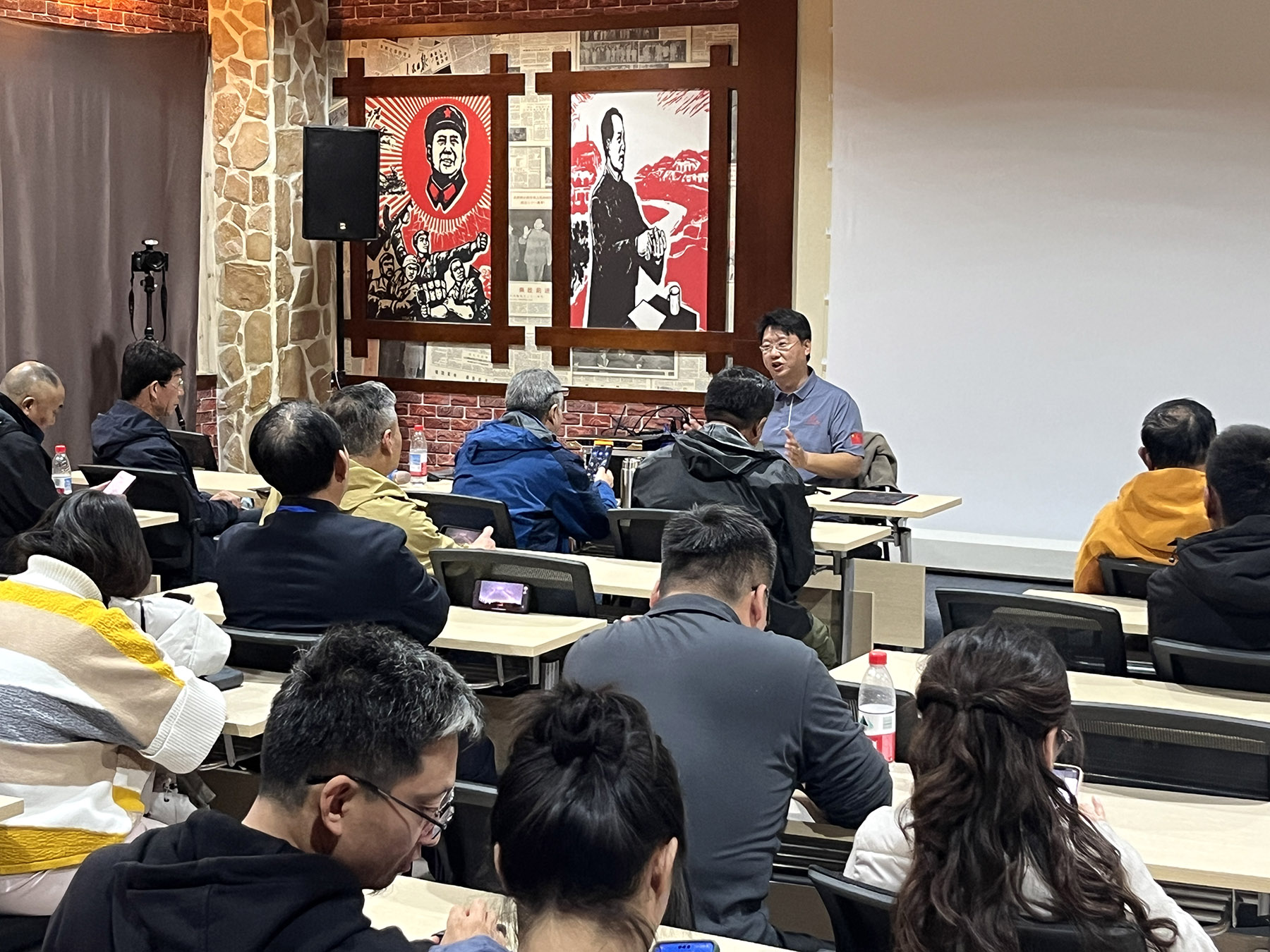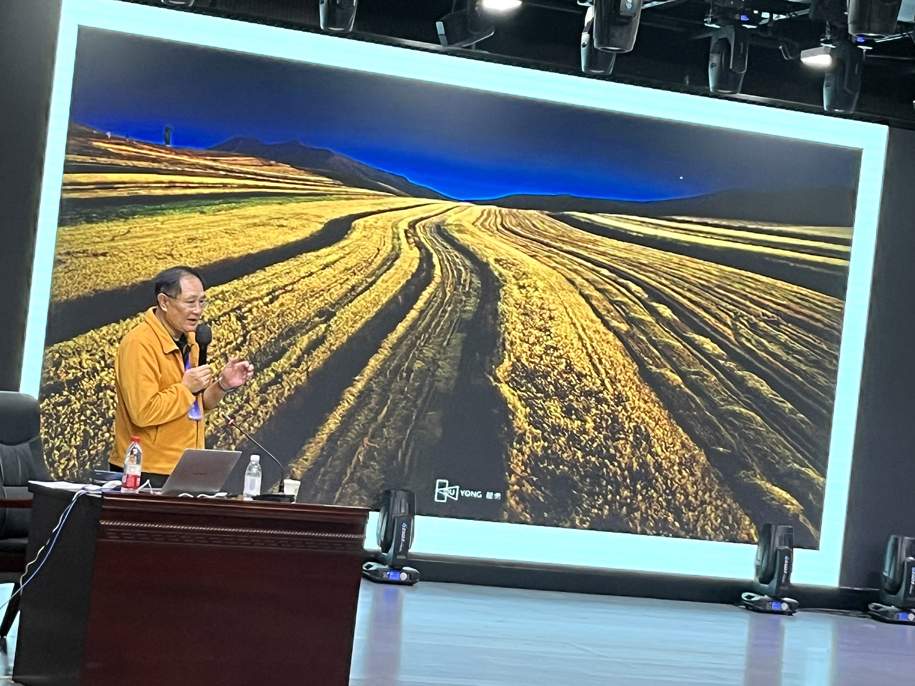 Cui Yong presents a lecture on landscape photography using drones in Hami city on Sept 21, 2025. (CHEN LIANG / CHINA DAILY)