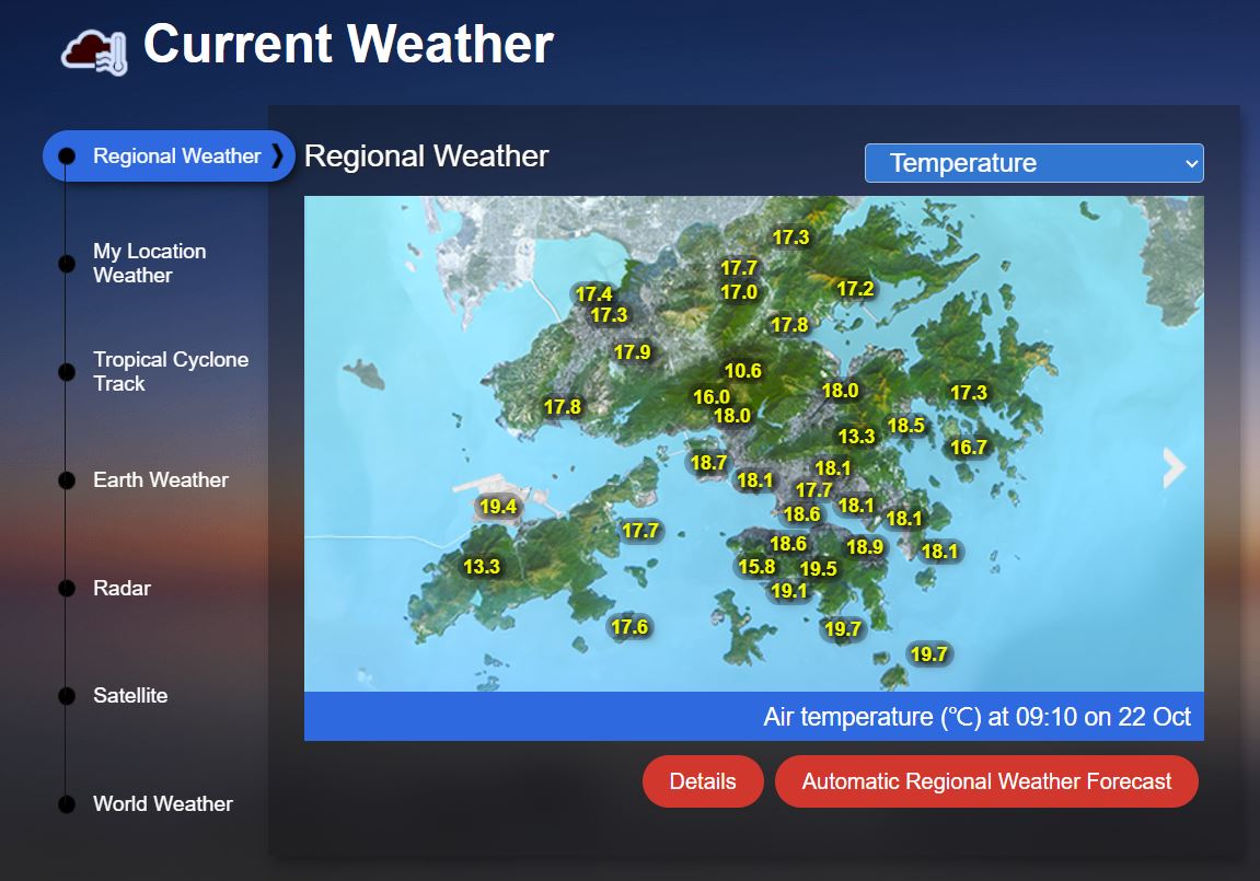 As of 9:10 am, the temperature across the city was generally below 18 degrees. Tai Mo Shan logged the lowest temperature at 10.6 degrees, followed by 13.3 degrees in Ngong Ping and 15.8 degrees at the Peak.