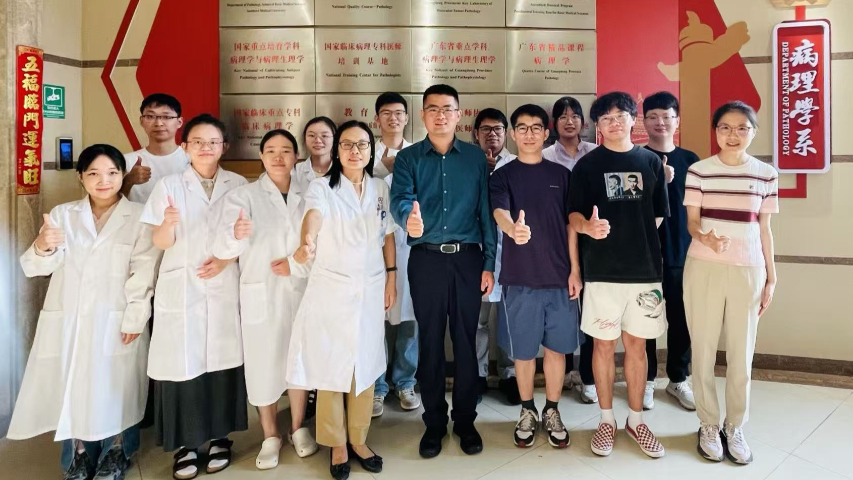 This undated photo shows Chen Hao (front row, fourth right), director of Collaboration Center for Medical and Engineering Innovation and assistant professor of the Department of Computer Science and Engineering and Department of Chemical and Biological Engineering of the HKUST; Liang Li, director of Department of Pathology at Nanfang Hospital and professor of School of Basic Medical Sciences at Southern Medical University (front row, fourth left) and the members from both research teams. (PROVIDED TO CHINA DAILY)
