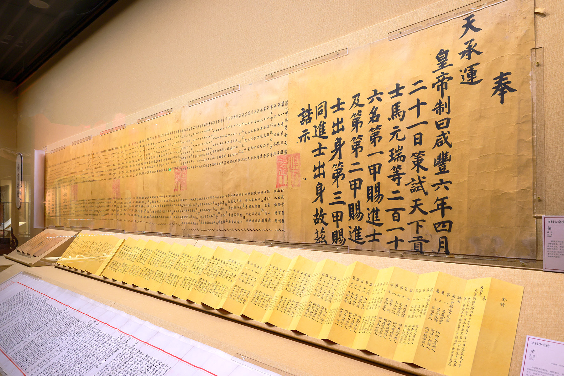 Another gallery in the exhibition celebrates excellence in scholarship through the imperial examinations. Two eye-catching artifacts dominate the space: large and small golden lists announcing the names of candidates who passed the final stage of the Qing examination system. The imposing larger list would once have been pasted on the walls of imperial gates for public viewing, while the smaller version was reserved exclusively for the emperor's desk.
