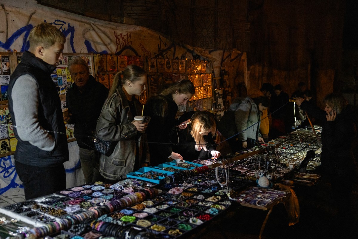 Local residents look at jewelry under the light of a flashlight at the souvenir street market on the Andriivskyi Descent in the Podil neighborhood during a power outage in Kyiv, on Oct 23, 2025, (PHOTO / AFP)