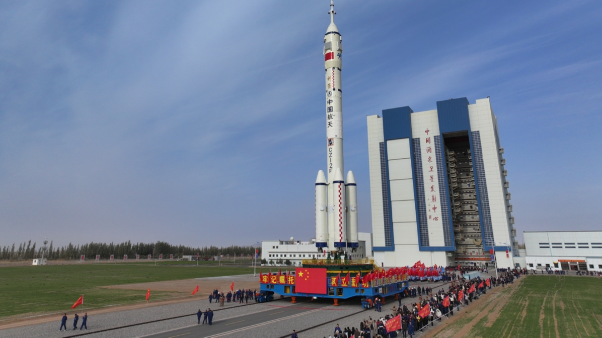 The combination of Shenzhou XXI spaceship and Long March 2F carrier rocket is transferred to launching area on Oct 24, 2025. (PHOTO / XINHUA)