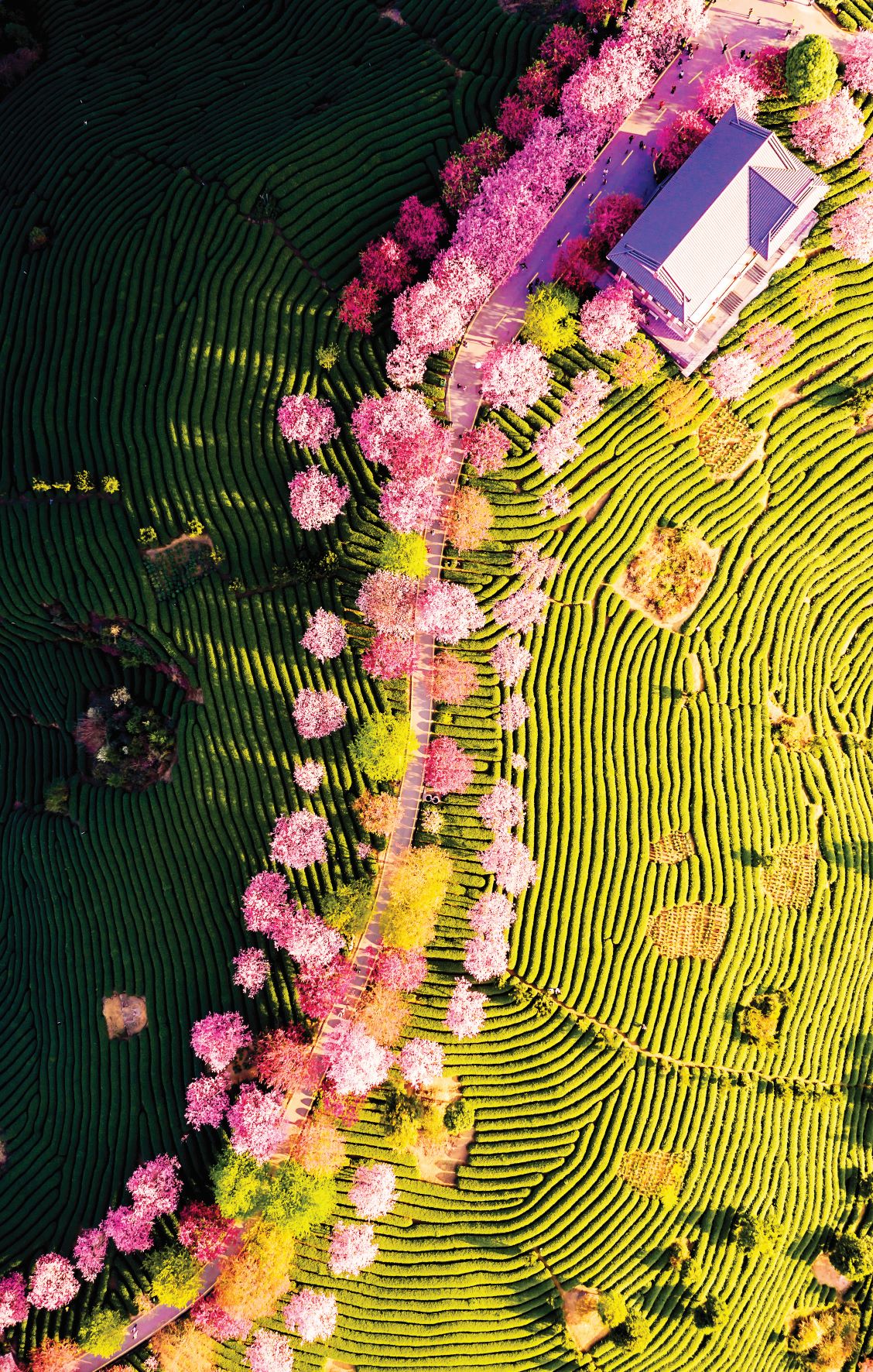 Tea plantations and blooming cherry blossoms adorn a mountainous region in Longyan, Fujian province. (PROVIDED TO CHINA DAILY)