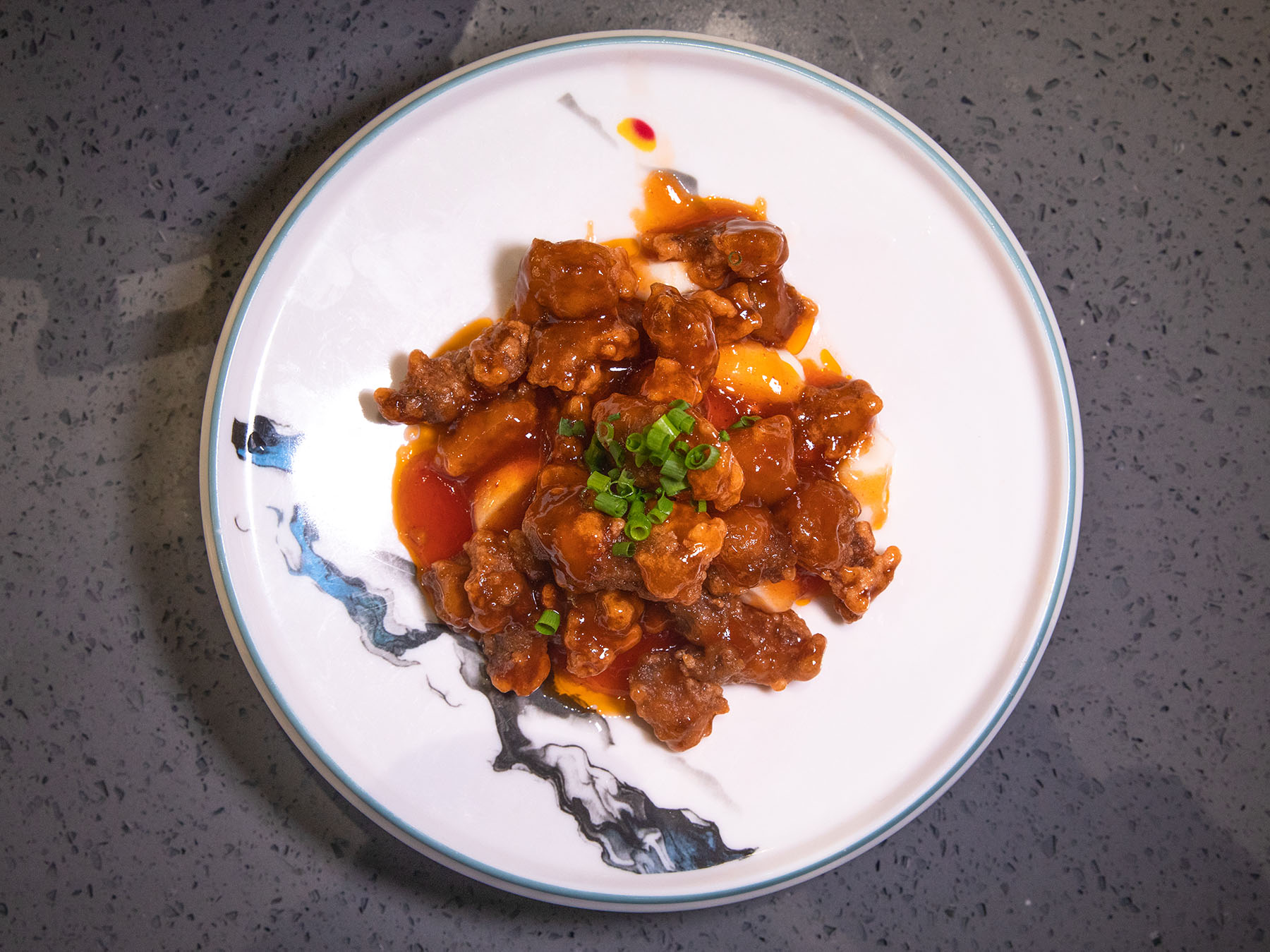 "The cuts must be two-thirds deep. When it's fried, it curls up like lychee fruit. The meat needs to be both lean and fat, then lightly coated with starch, so the 'lychee skin' pattern shows through the sweet-and-sour glaze," he says.