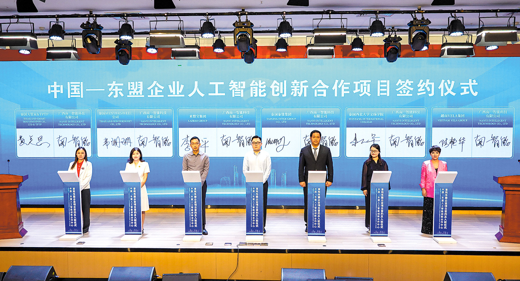Representatives from China and ASEAN companies sign an agreement for an AI innovation cooperation project in Nanning, the Guangxi Zhuang autonomous region, on June 29, 2025. (YE ZIRONG / FOR CHINA DAILY)