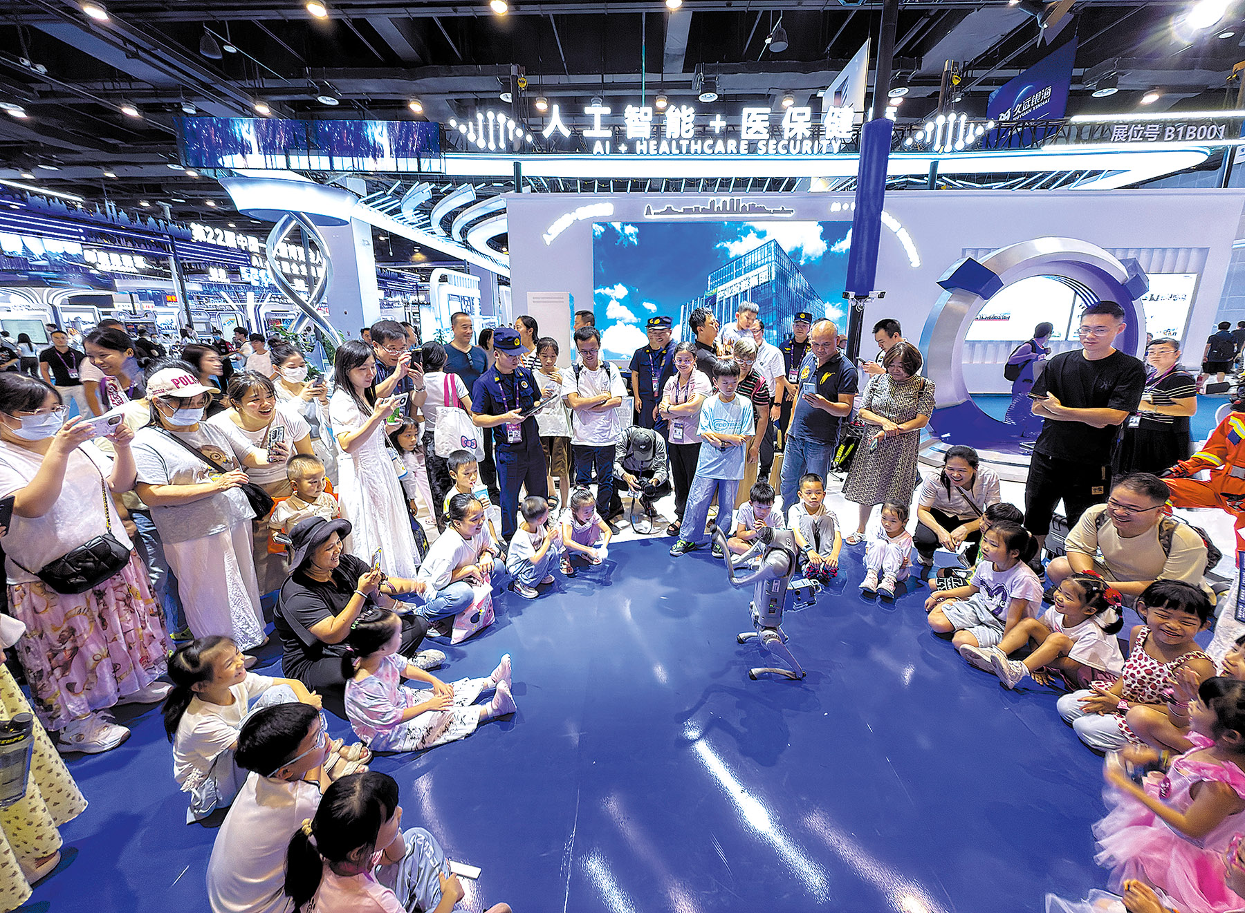 Children gather around a surveillance robotic dog during the 22nd China-ASEAN Expo on Sept 20, 2025. (PAN HAO / FOR CHINA DAILY)