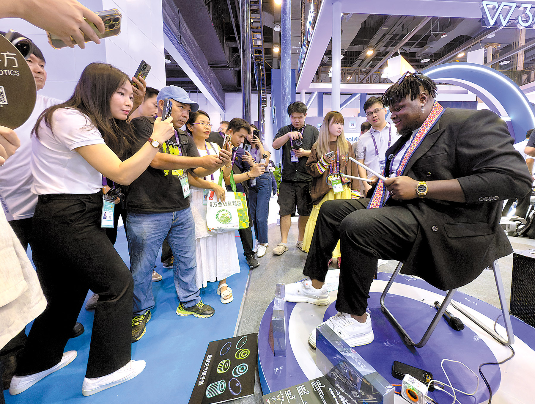 Expo guests take photos of a visitor playing the aerodrum on Sept 17, 2025. (PAN HAO / FOR CHINA DAILY)