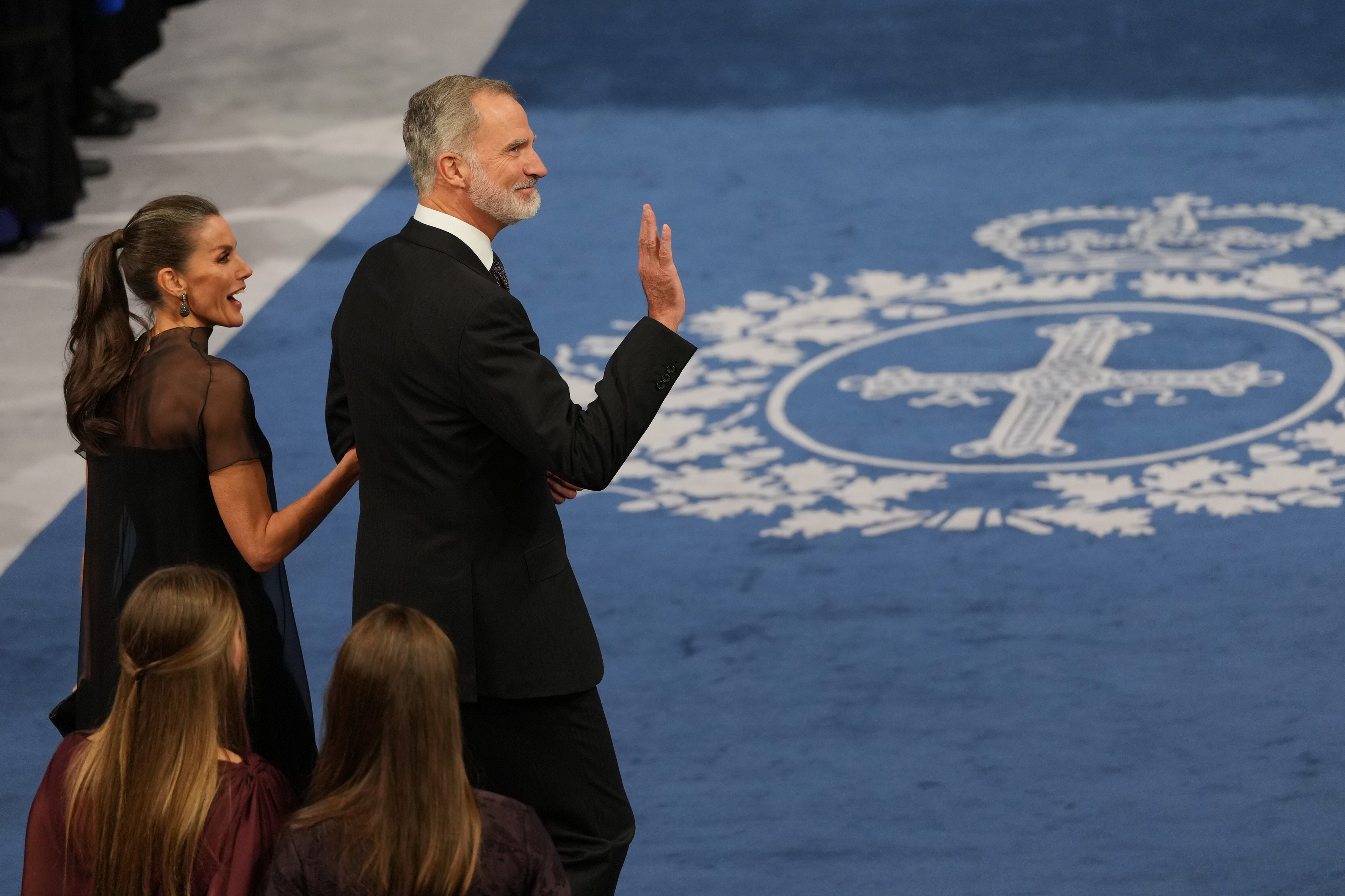 Spain's King Felipe VI and Queen Letizia wave as they arrive at the Princess of Asturias Awards in Oviedo, northern Spain, Oct 24, 2025. (PHOTO / AP)