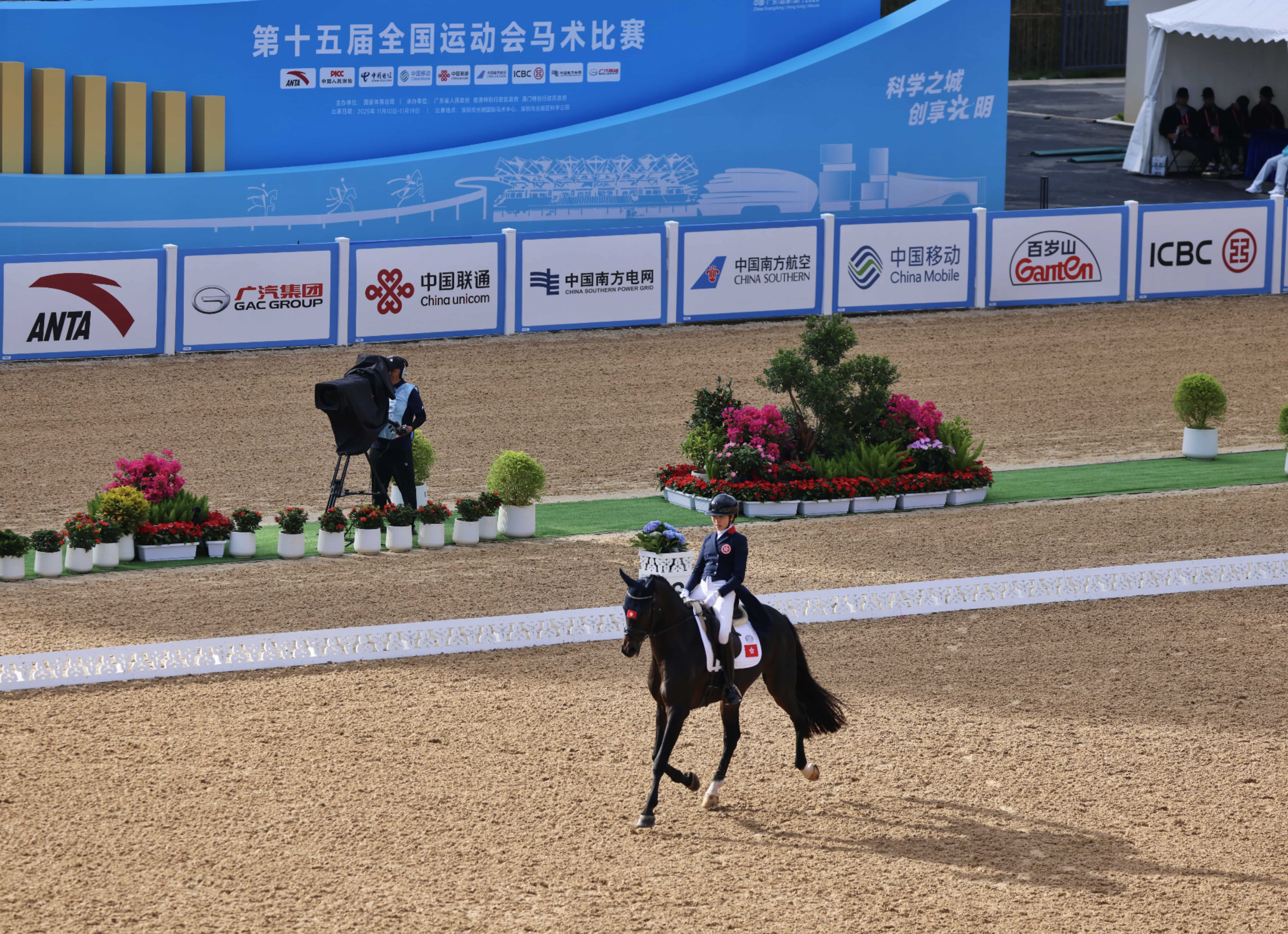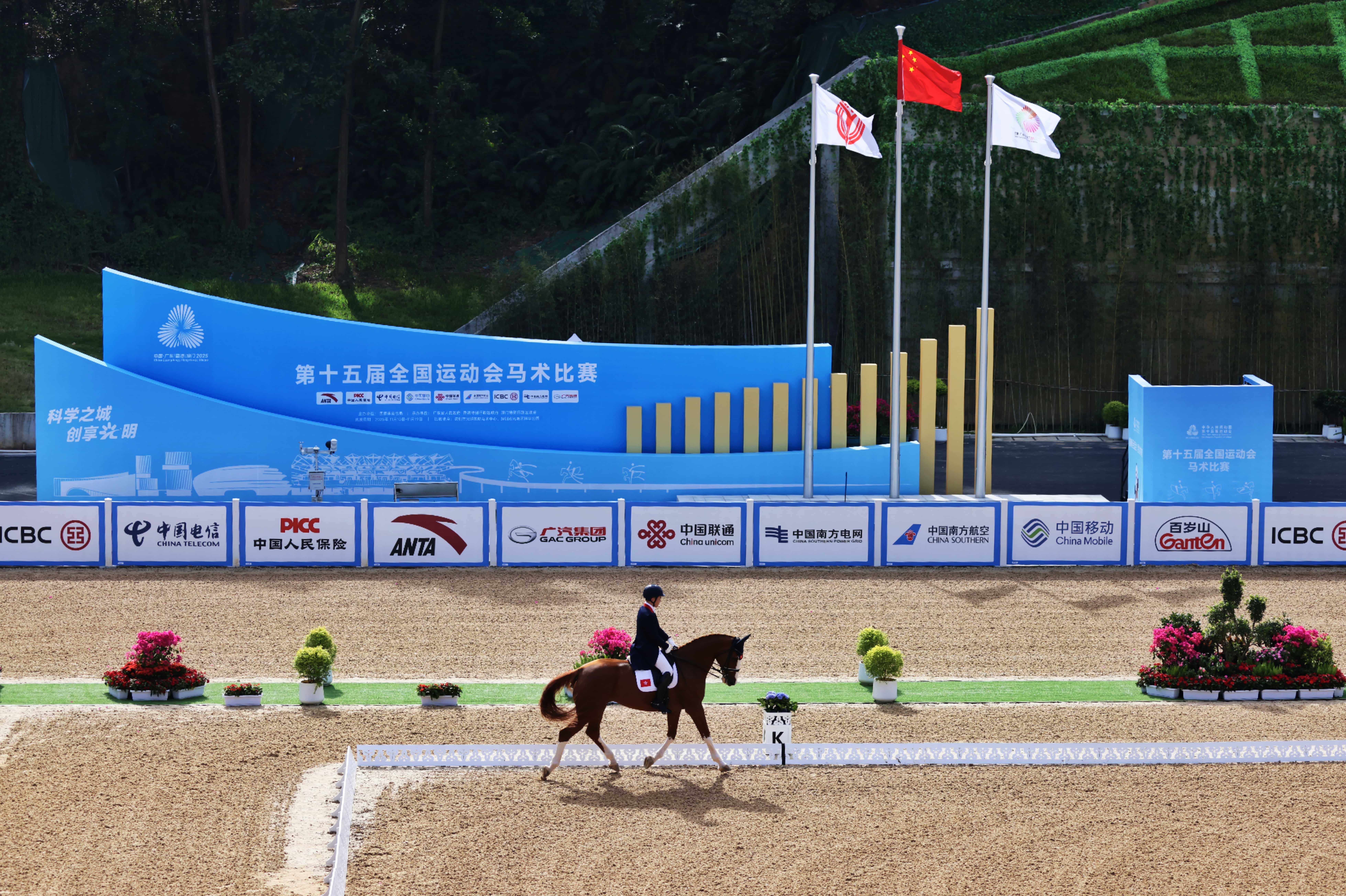 Hong Kong athlete Chen Baoling competes in the equestrian dressage event at the 15th National Games of the People's Republic of China on Nov 10, 2025, in Shenzhen, South China's Guangdong province. (PARKER ZHENG/CHINA DAILY)