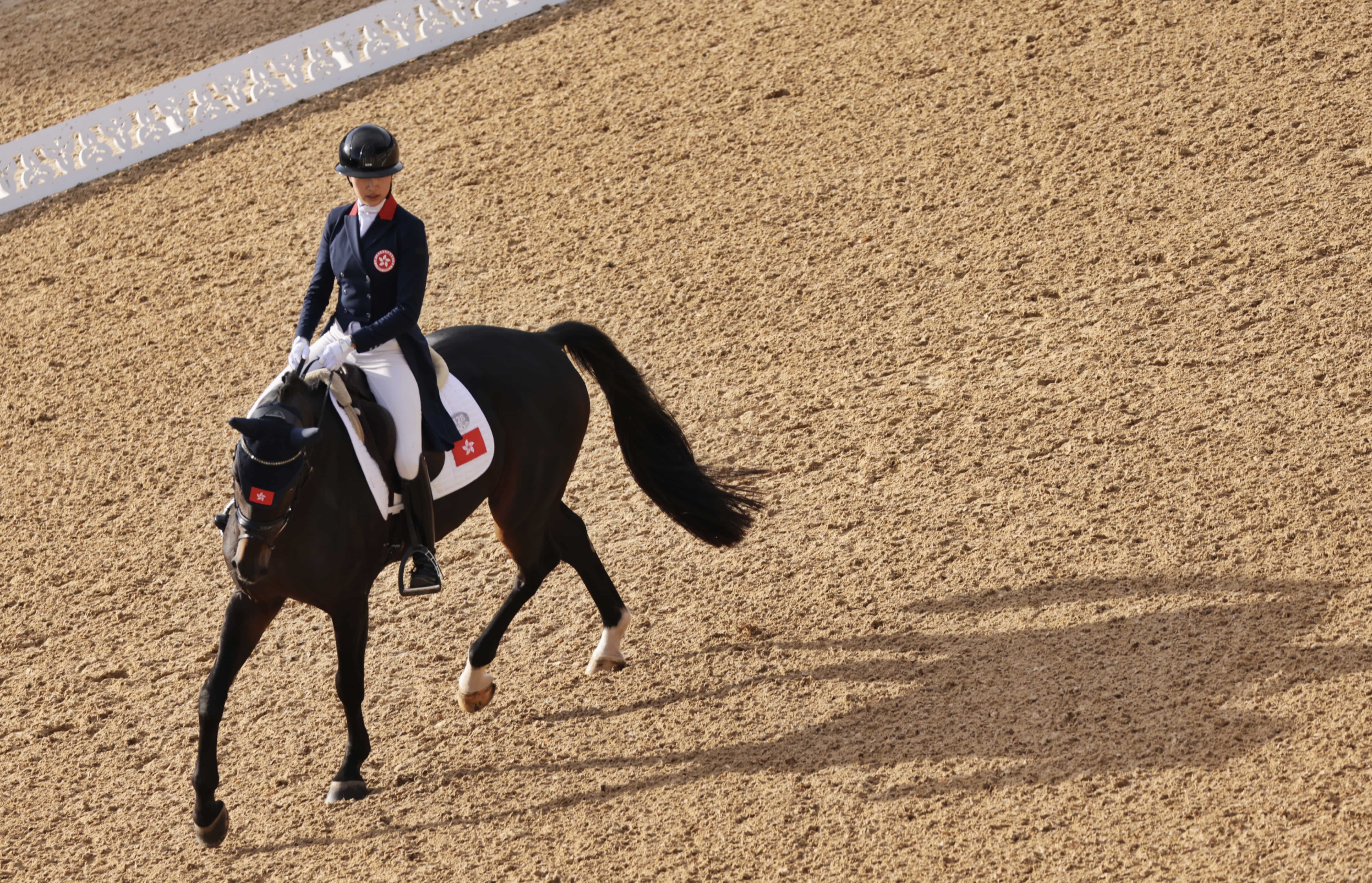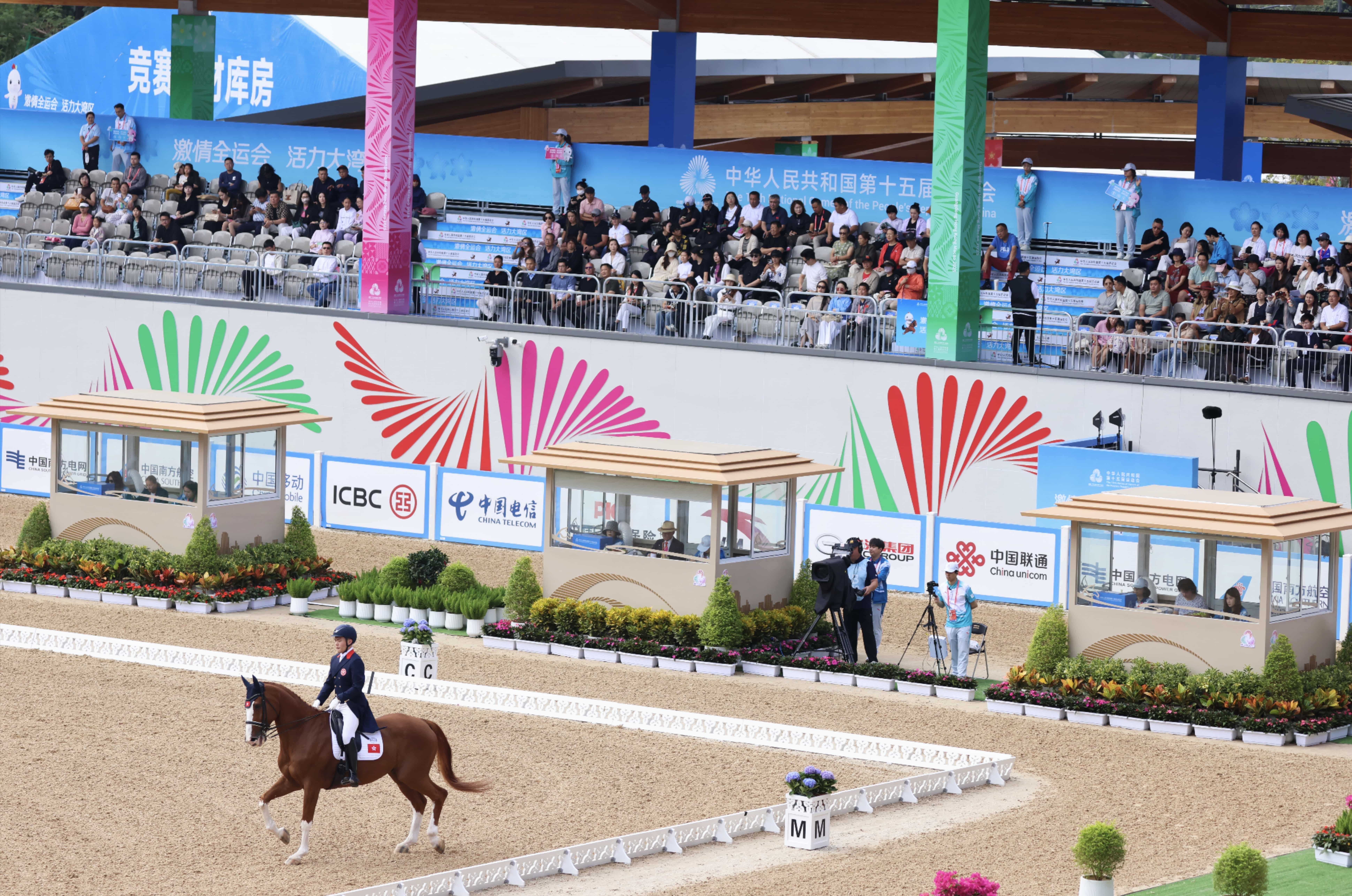 Hong Kong athlete Chen Cuiyan competes in the equestrian dressage event at the 15th National Games of the People's Republic of China on Nov 10, 2025, in Shenzhen, South China's Guangdong province. (PARKER ZHENG/CHINA DAILY)
