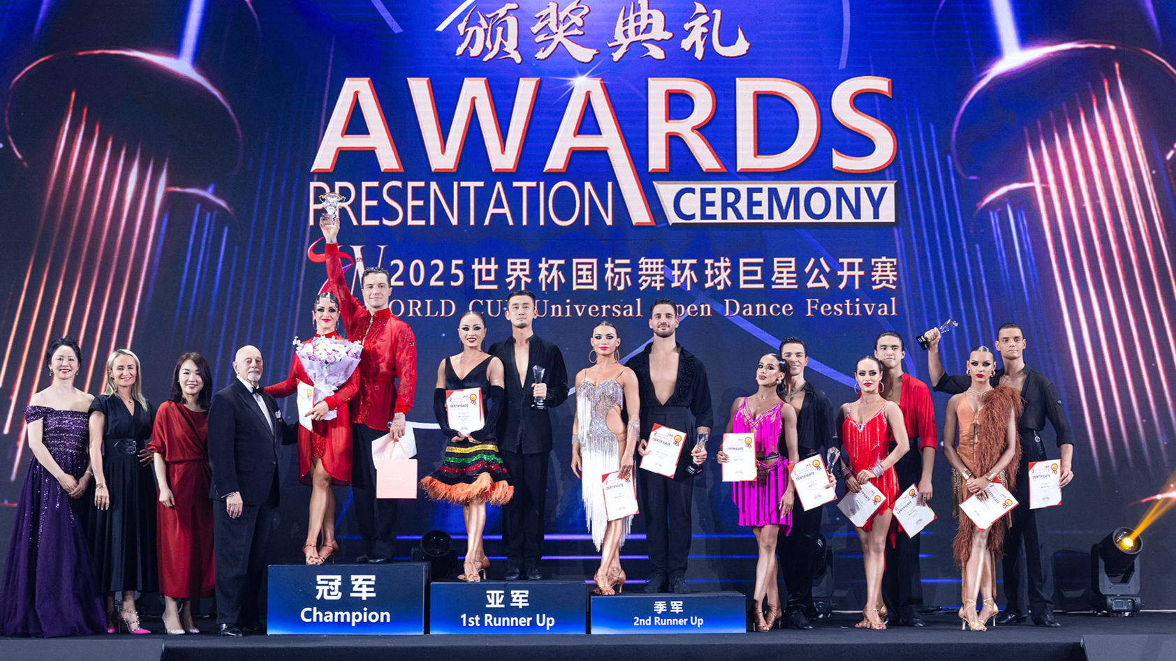 A prize-giving ceremony being held for the top amateur Latin couples in the 2025 World Cup Universal Open Dance Festival in Shenzhen, Guangdong province. (PROVIDED TO CHINA DAILY)