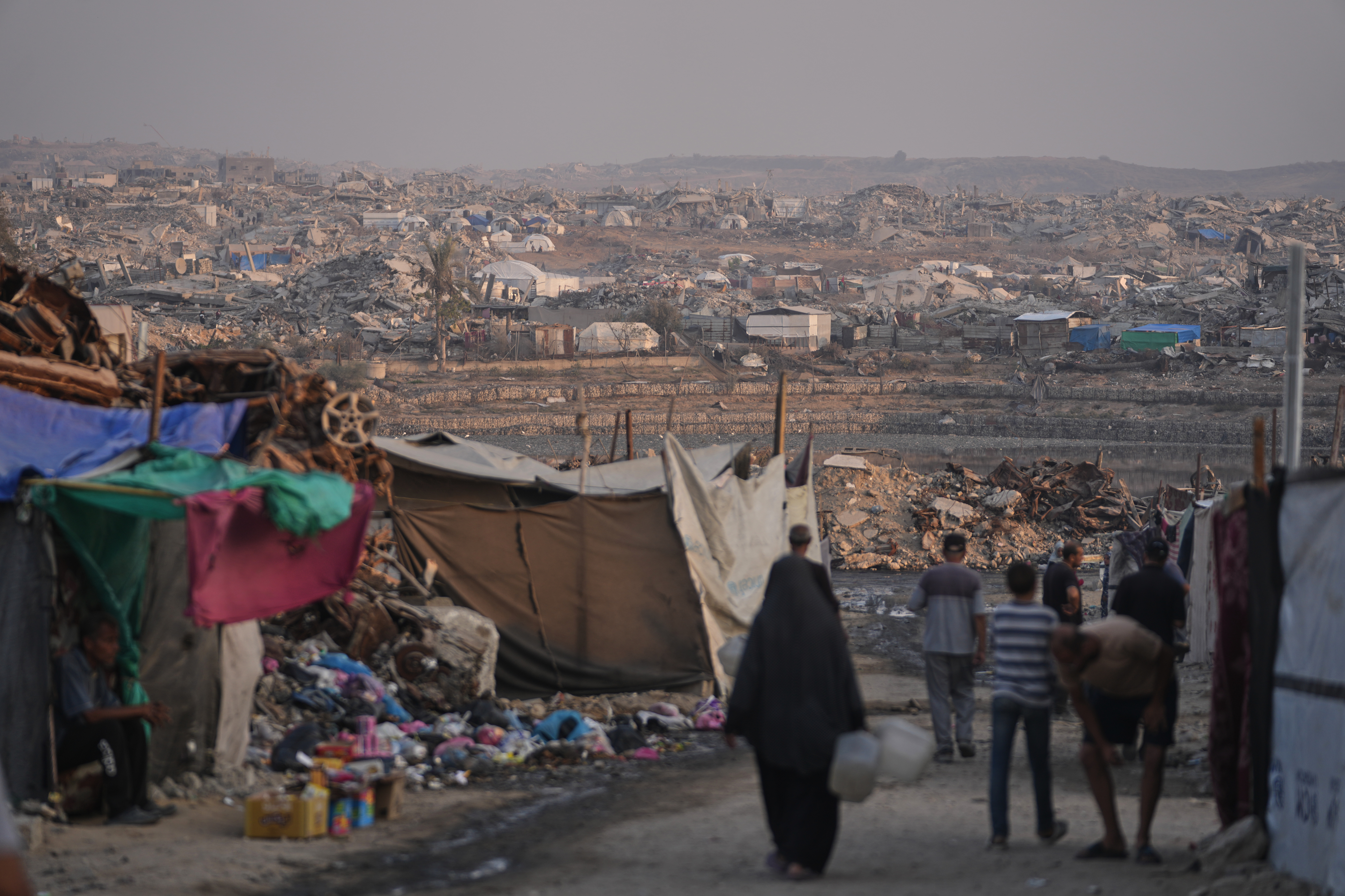 Displaced Palestinians walk through a tent camp in Sheikh Radwan neighborhood in Gaza City, Nov 10, 2025. (PHOTO / AP)
