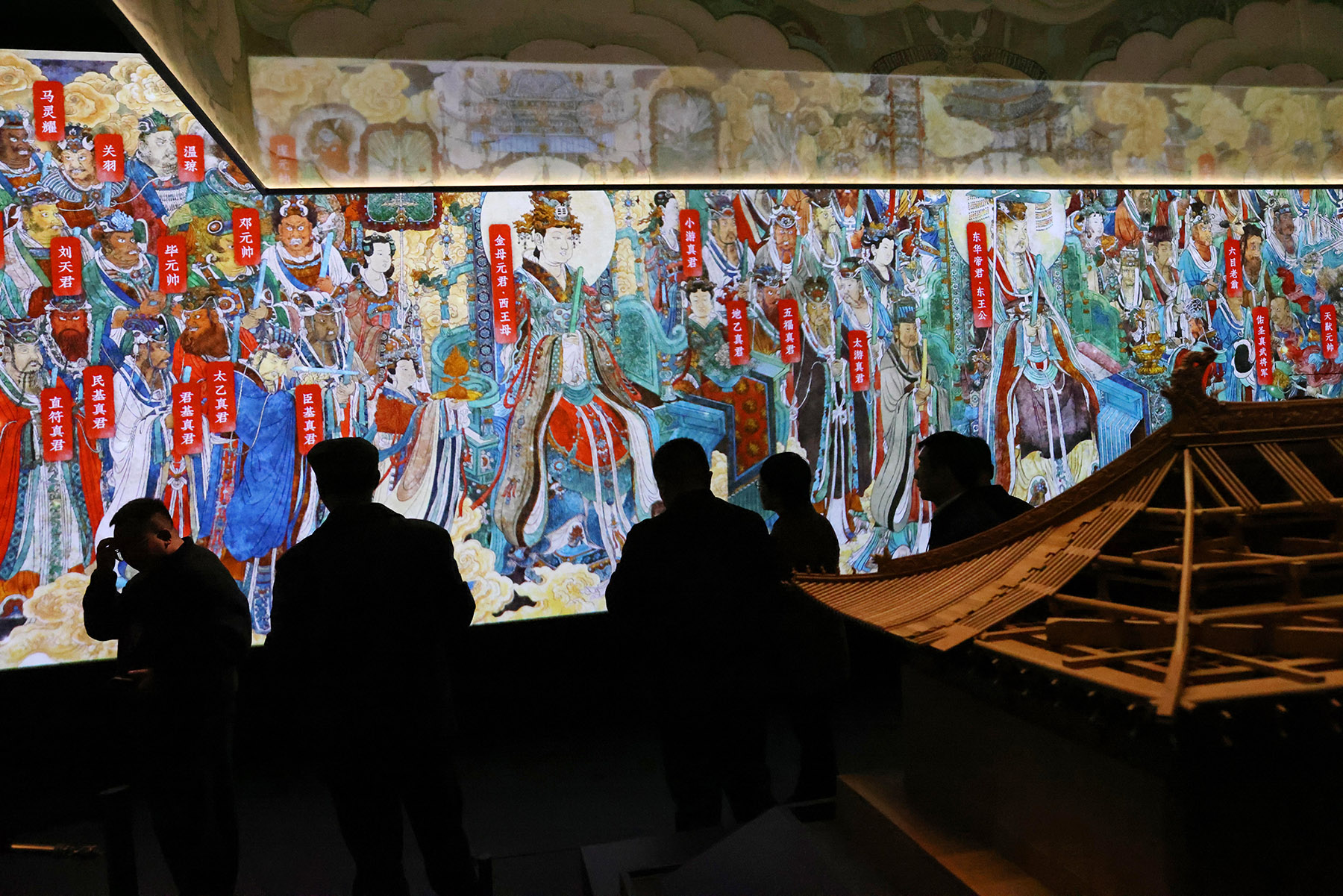 In the Xuankong Temple section, digital light and shadow dance across a wooden model, evoking the temple's precarious perch on a cliff face. Another section dedicated to the Yuhuang Temple (Jade Emperor Temple) features seven brightly painted clay sculptures of celestial beings re-created by Li Yuanchao, an artisan who used traditional methods to capture the vivid expressions and flowing robes of the originals.