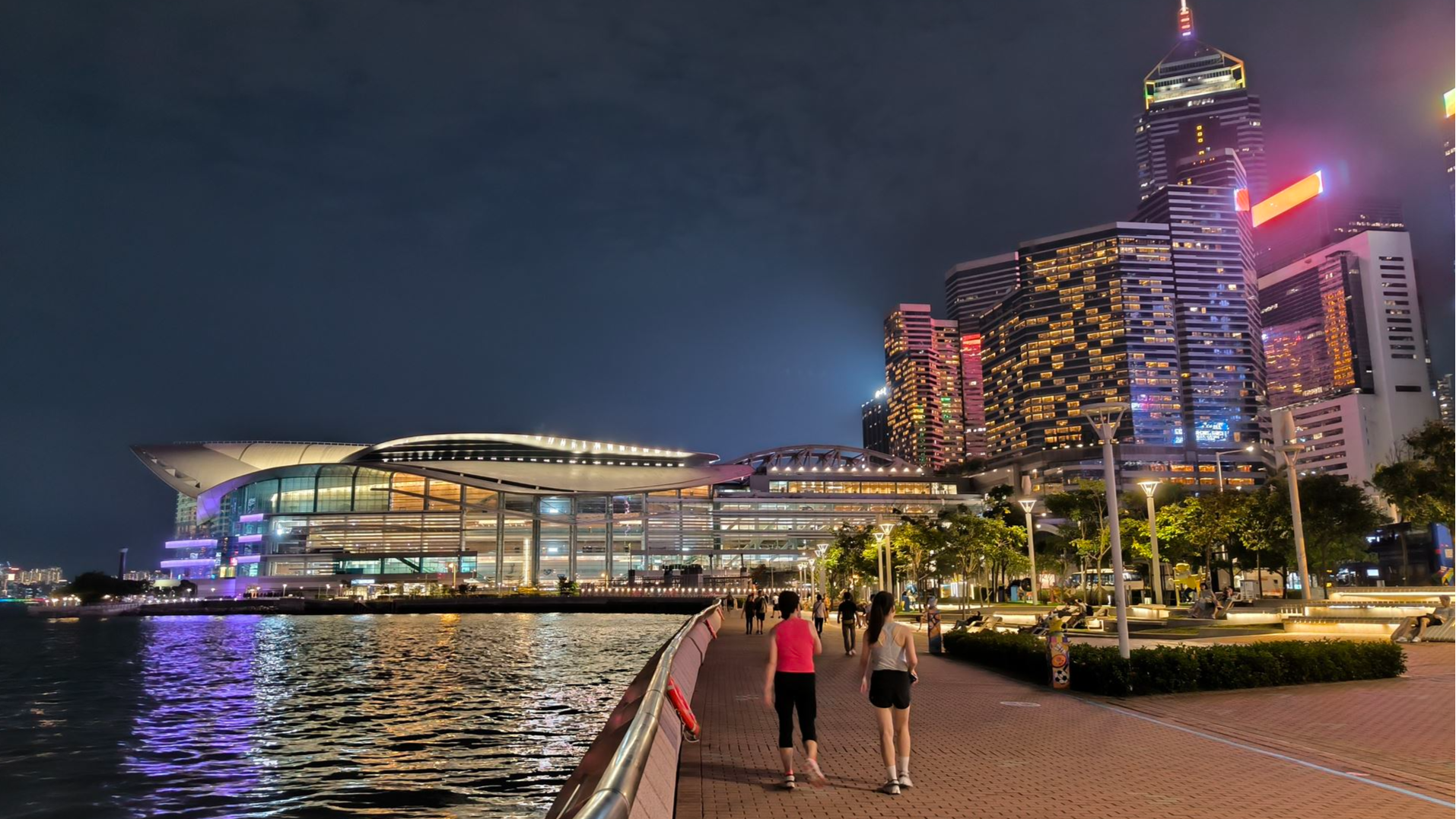 Hong Kong Convention and Exhibition Centre and skyscrapers in Wan Chai serve as a stunning backdrop for people exercising at the Victoria Habour on Sept 16, 2024. (J. LU / CHINA DAILY)