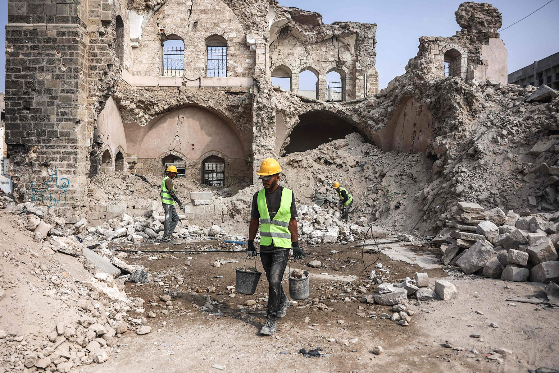 Workers start rehabilitation on what remains of a palace that once housed 40,000 artifacts representing the succession of civilizations in the region, in Gaza City, on Nov 11, 2025. (PHOTO / AFP)