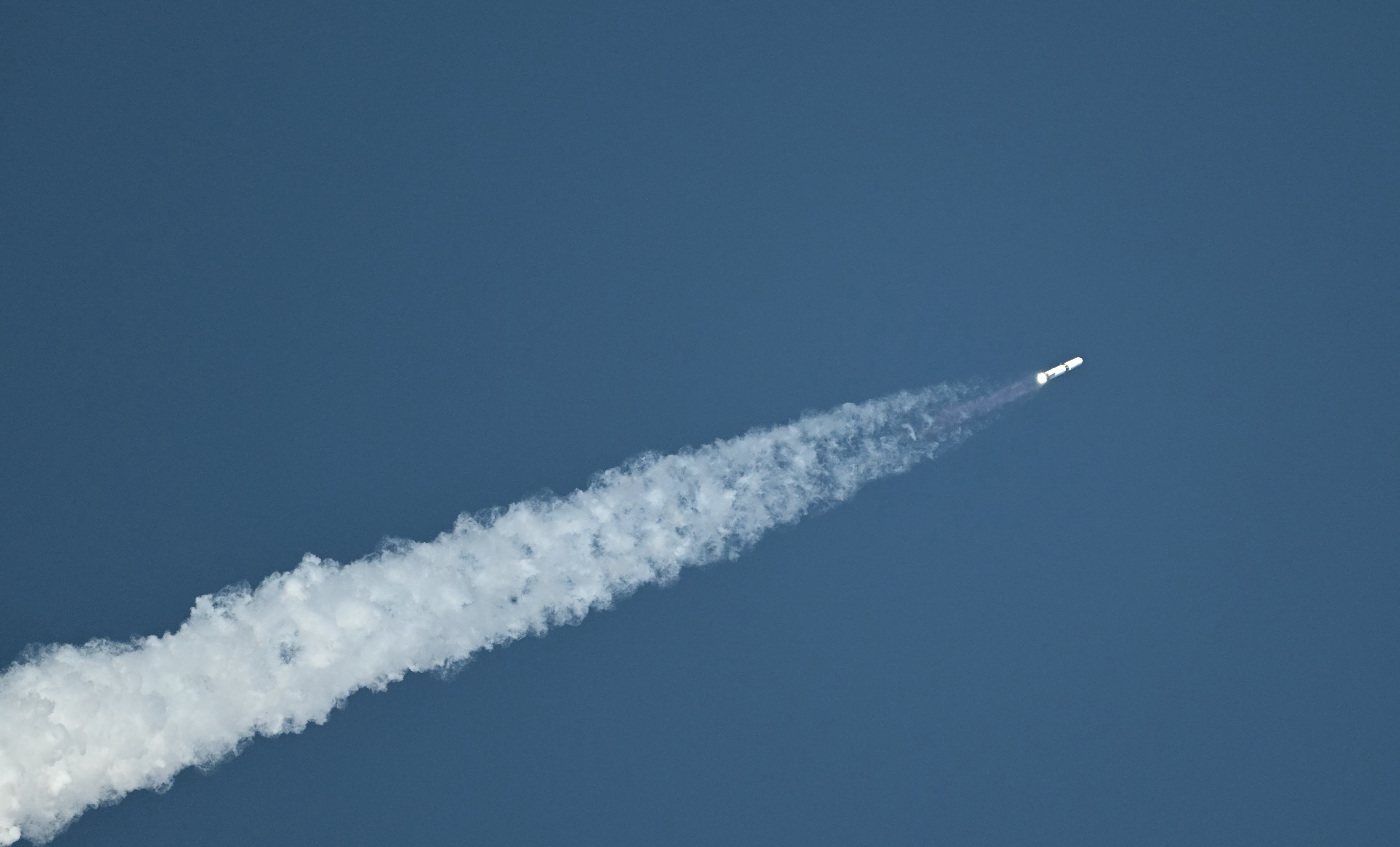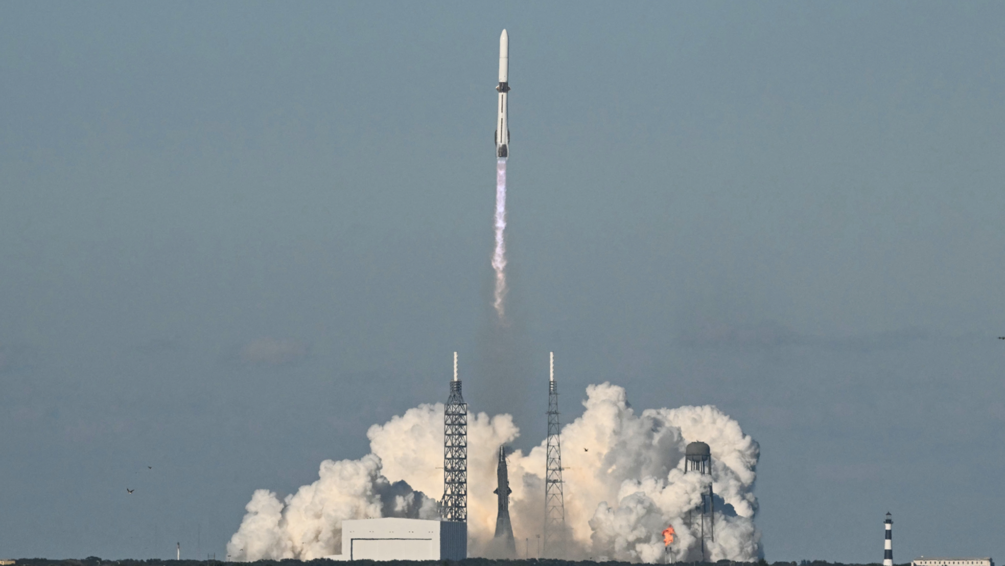 A live Blue Origin webcast showed the rocket ascending from its launch tower through clear afternoon skies in a thunder of flames and billowing clouds of vapor moments after its seven BE-4 liquid-fueled engines roared to life. The launch followed several days of delays due to cloudy skies and a geomagnetic storm.