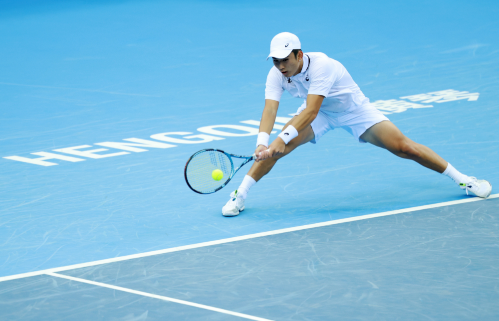 Shang Juncheng of Beijing hits a return to Zhou Yi of Guangxi during the men's tennis singles semifinal event at the 15th National Games in Hengqin, South China's Guangdong province, on Nov 19, 2025. (PHOTO / XINHUA)