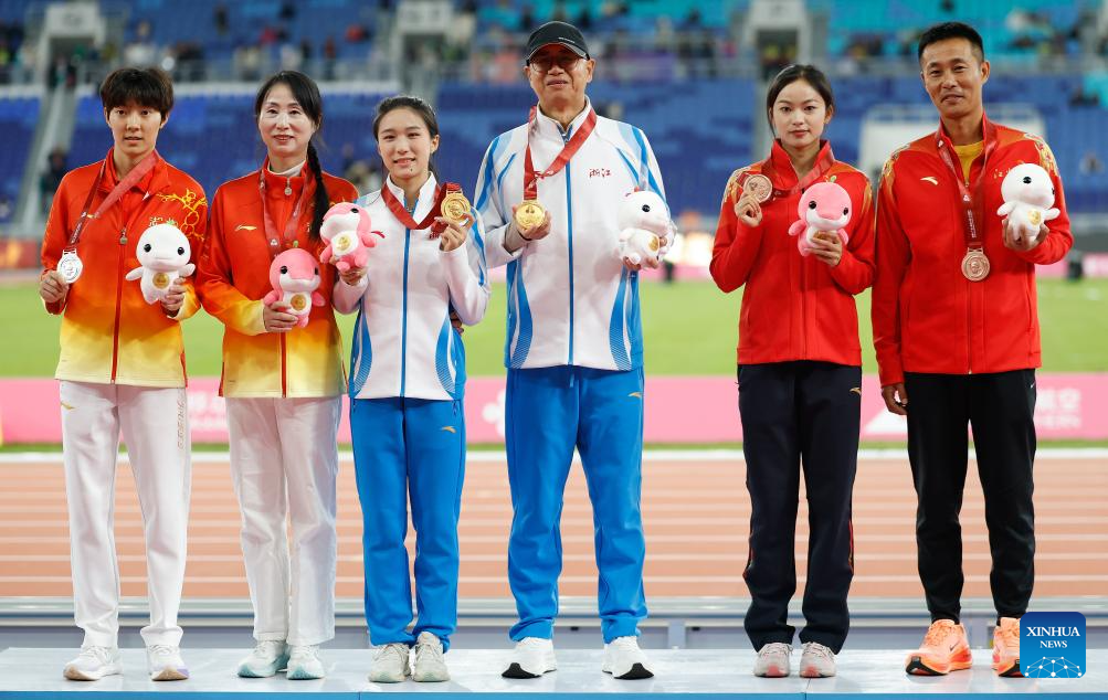 Gold medalist Chen Yujie (center left) of Zhejiang, silver medalist Zhu Junying (first left) of Hubei, bronze medalist Cai Yanting (second right) of Jiangsu pose during the awarding ceremony for the women's 200m of athletics at China's 15th National Games in Guangzhou, South China's Guangdong province, Nov 19, 2025. (PHOTO / XINHUA)