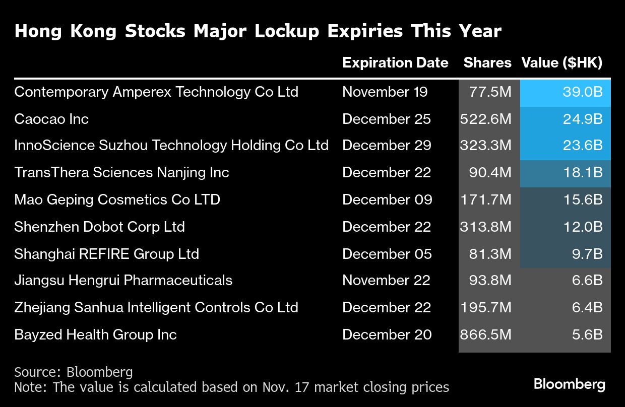 “Lockup expirations represent a clear risk factor for Hong Kong equities before year-end,” said Ravi Wong, first vice-president at Yan Yun Family Office (HK) Ltd. “It’s normal for investors to take profits after this year’s gains, whether at the stock level or across the broader market.”