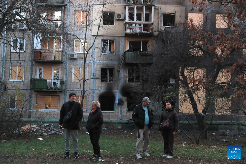 People stand in front of a damaged residential building after the overnight strikes by Russian drones and ballistic missiles in Kyiv, Ukraine, Nov 14, 2025. (PHOTO / XINHUA)