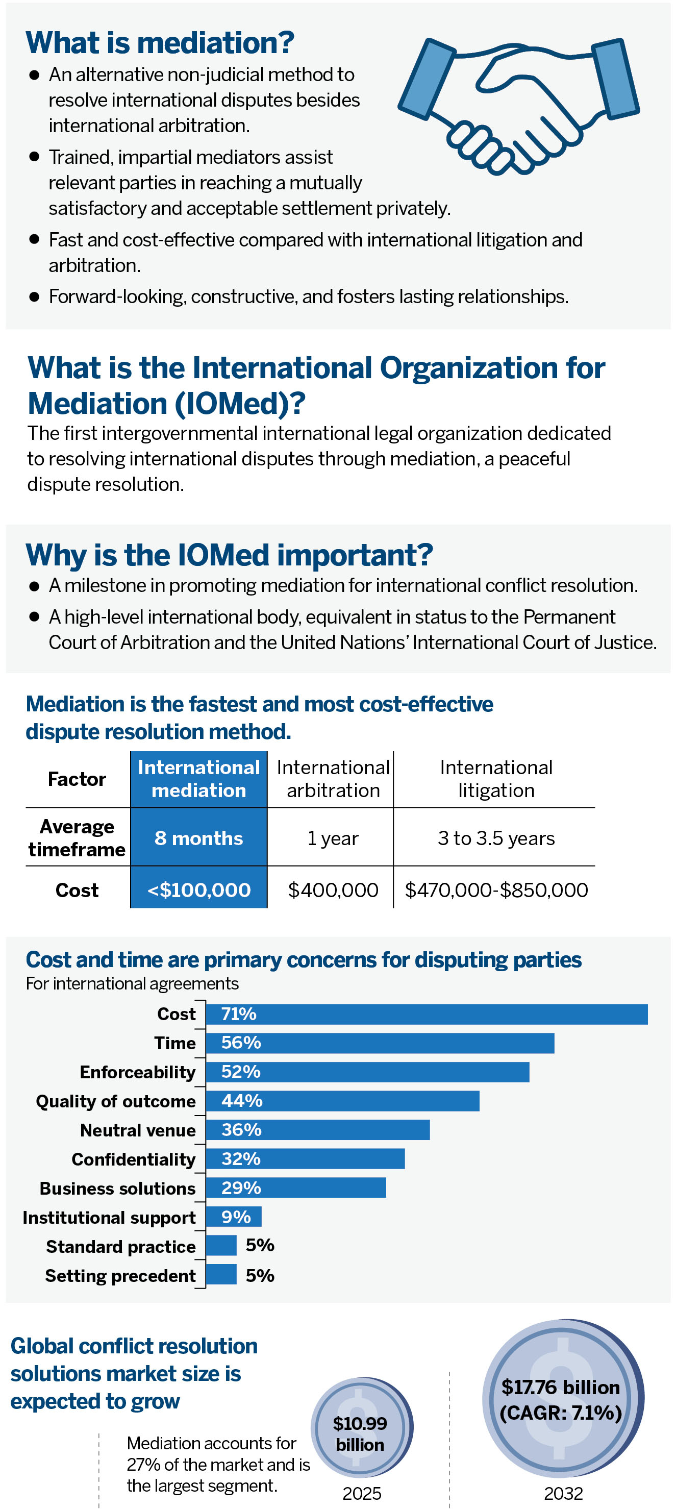 The launch of the International Organization for Mediation in Hong Kong on Oct 20 marks a pivotal shift in the global resolution of conflicts, establishing a collaborative alternative to costly and adversarial legal battles that have long dominated the international stage, experts say.