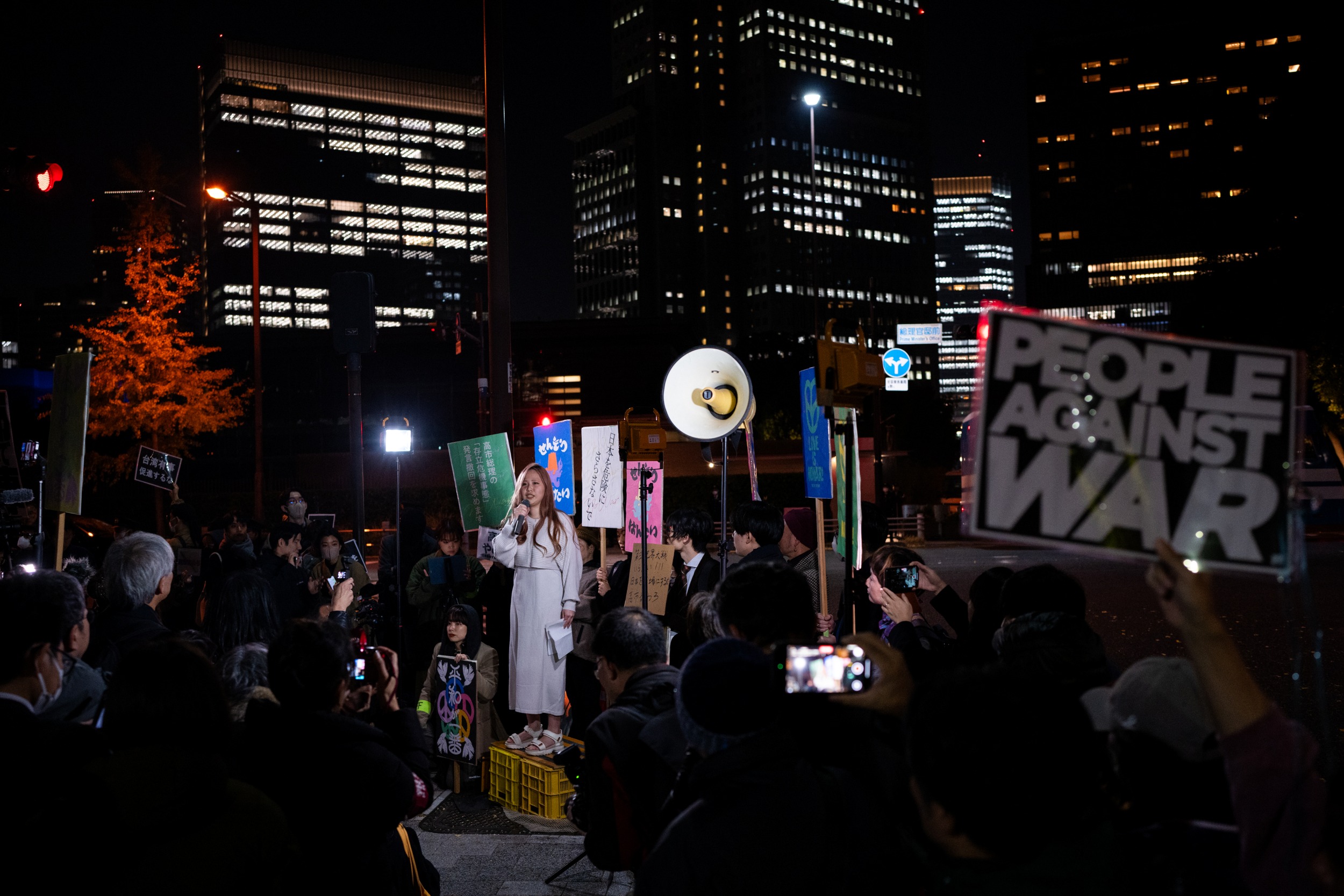 People started to arrive at the rally around 7 pm local time, holding signs with slogans such as "Retract remarks, oppose war", "This is all because of Takaichi", and "Takaichi step down". They shouted out slogans like "Prevent the resurgence of militarism".
