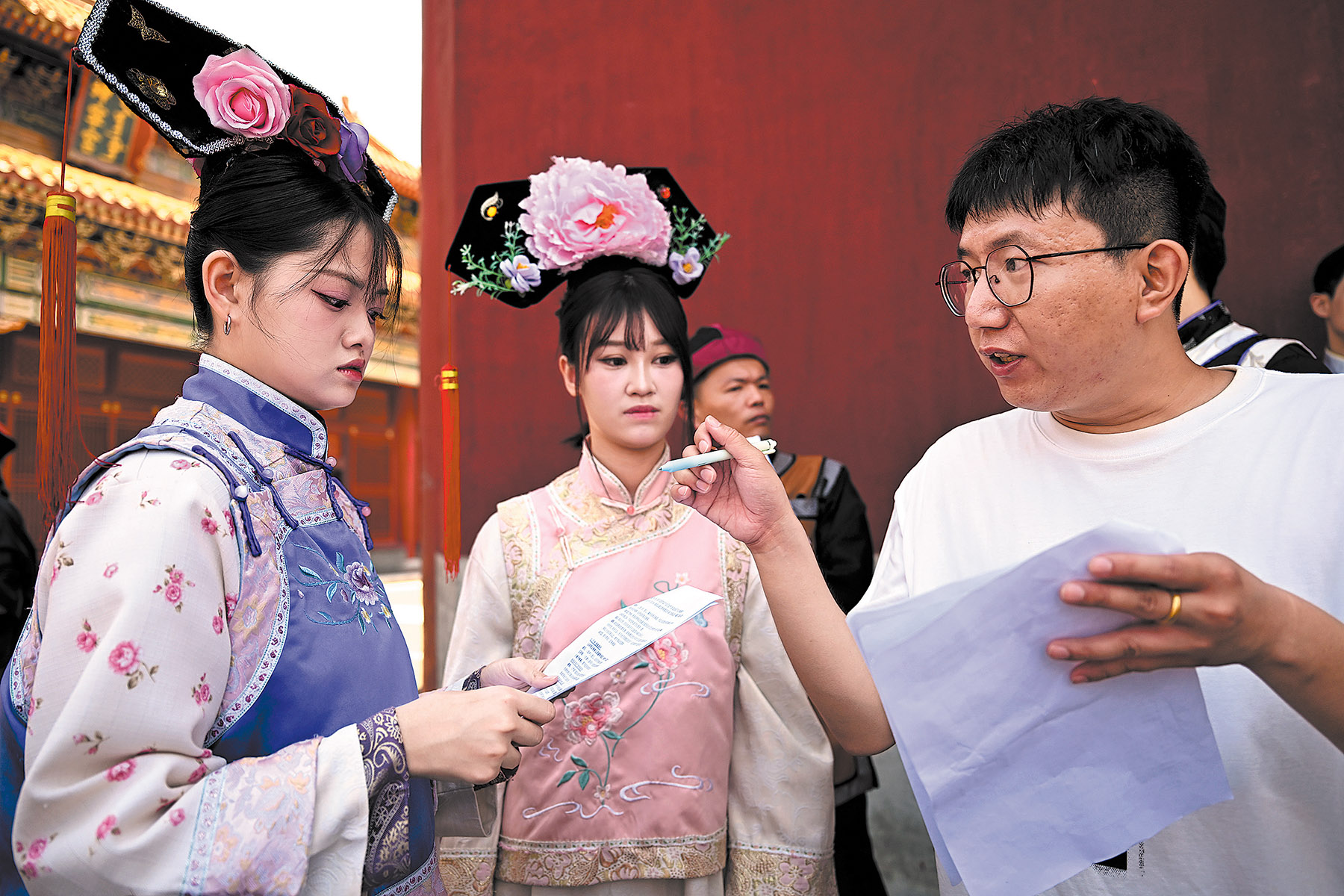 A director discusses the script of a micro-drama with actresses in Hengdian World Studios in Zhejiang province, in June 2025. (PHOTO / CHINA NEWS SERVICE)