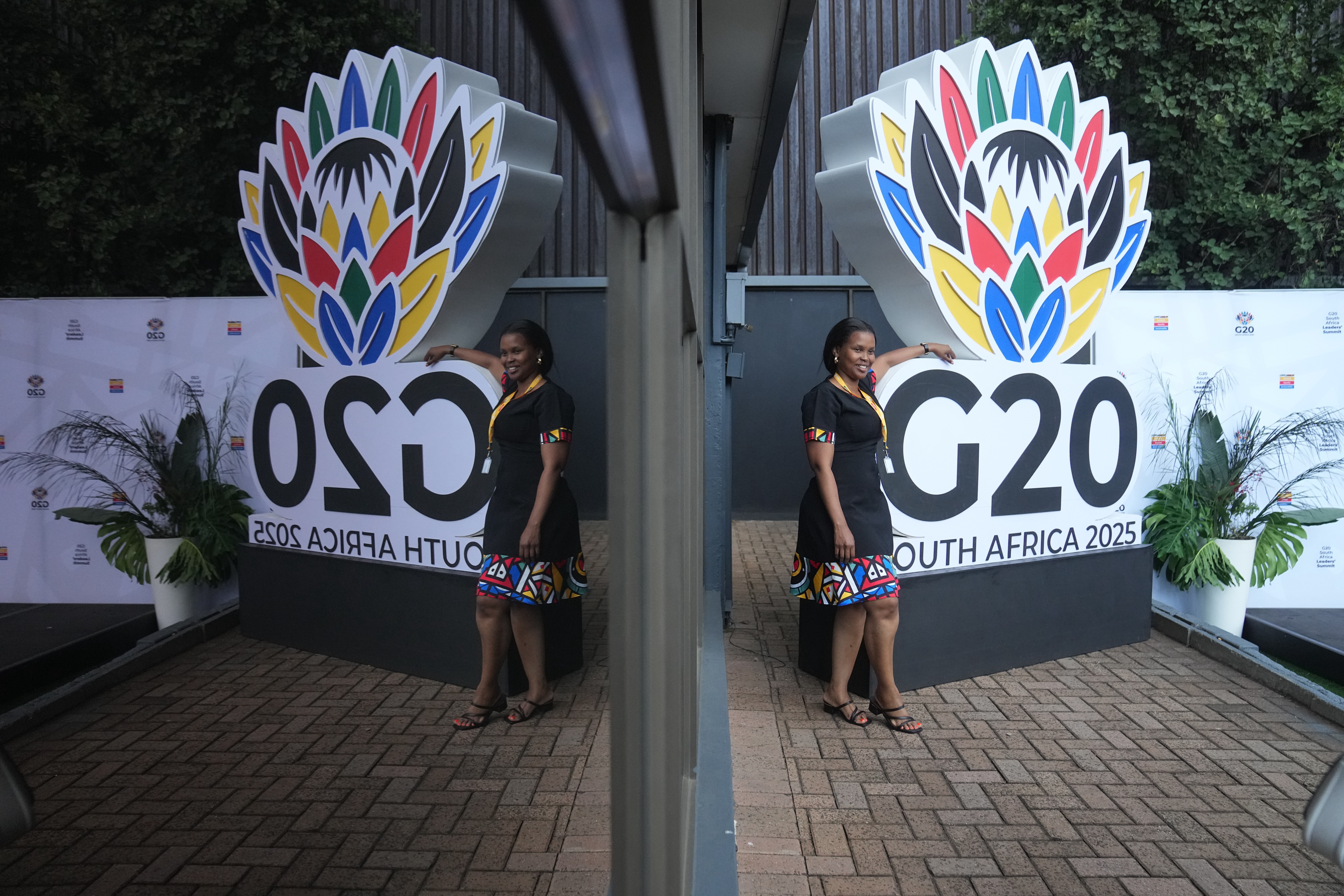 A summit volunteer poses in front to the logo at the entrance of the press room of the G20 leaders' summit in Johannesburg, South Africa, Nov 22, 2025. (PHOTO / AP)