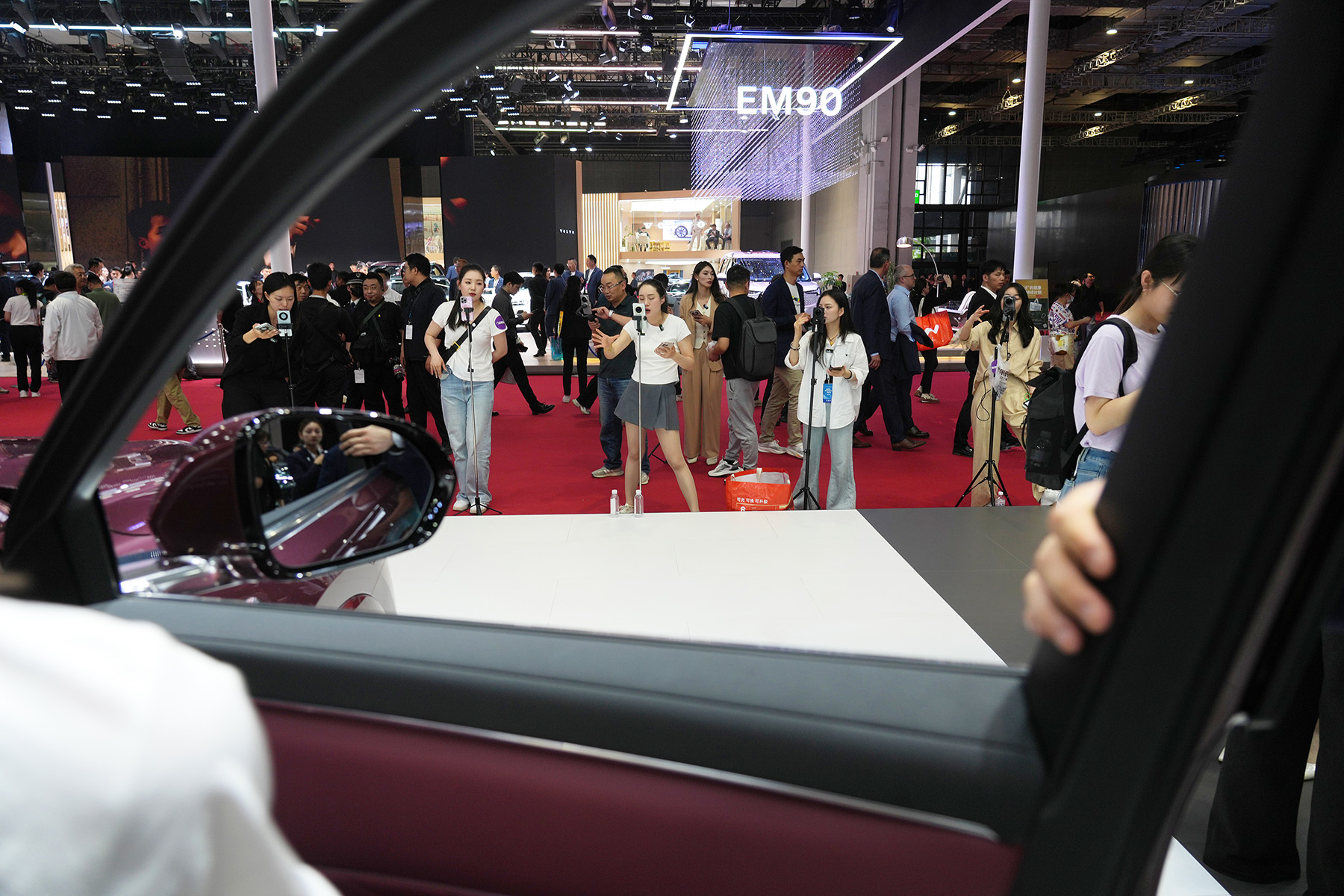 Saleswomen detail the merits of automobiles at the 21st Shanghai International Automobile Industry Exhibition on April 24, 2025. (PHOTO / CHINA NEWS SERVICE)
