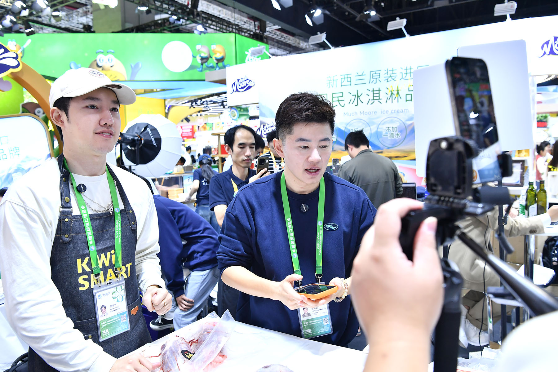 Hosts of Shanghai Onair Studio promote dairy products from New Zealand via livestreaming during the China International Import Expo in Shanghai in November 2025. (PROVIDED TO CHINA DAILY)