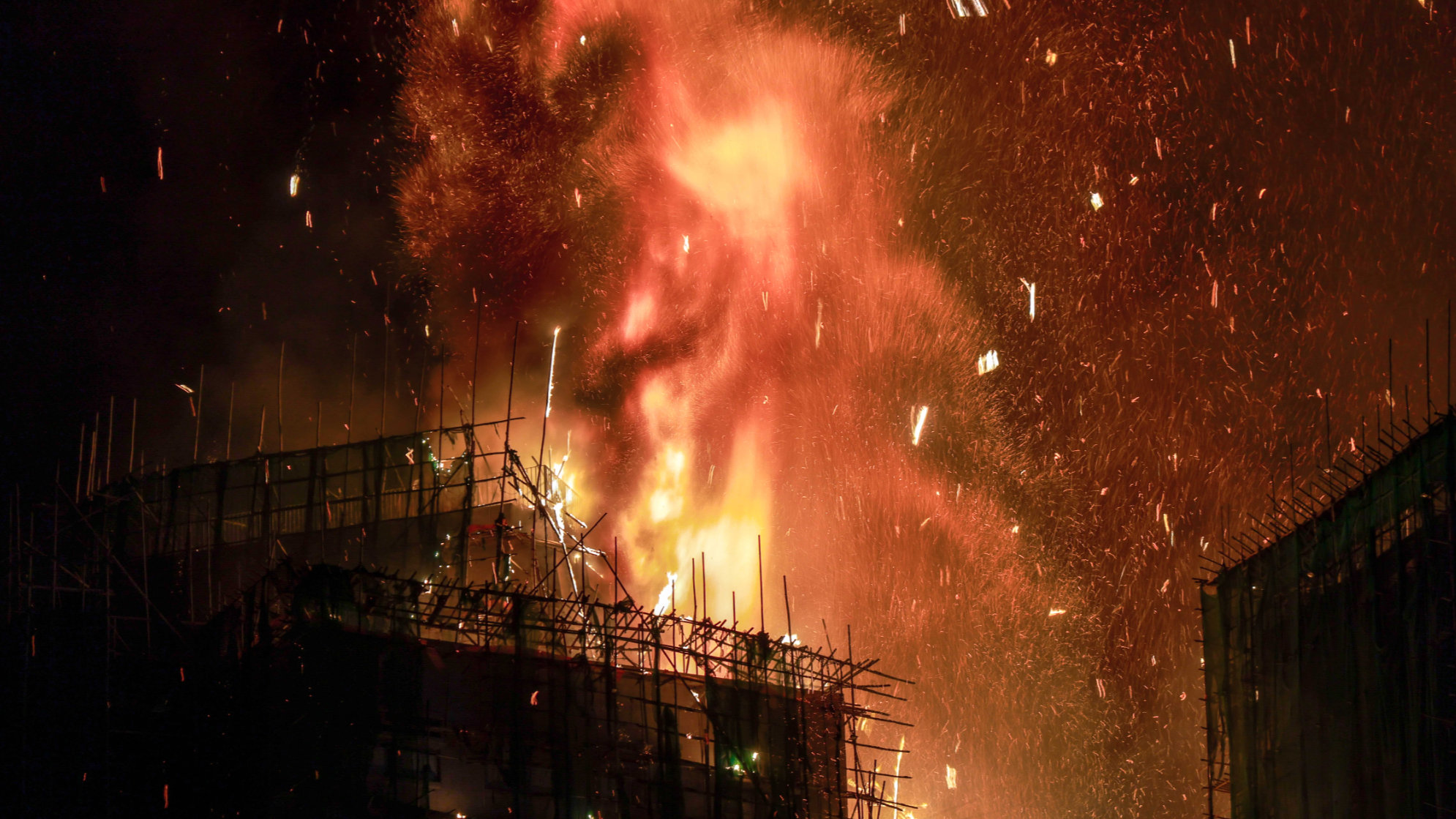 Flames engulf the bamboo scaffolding across multiple buildings at Wang Fuk Court housing estate in Tai Po, Hong Kong, Nov 26, 2025. (ANDY CHONG/ CHINA DAILY)