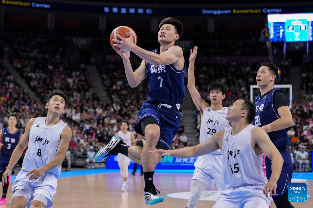 Wang Ruize (top) of Guangdong competes during the men's basketball final between Guangdong and Zhejiang at the 15th National Games in Qingyuan, South China's Guangdong province, Nov. 12, 2025. (PHOTO / XINHUA)