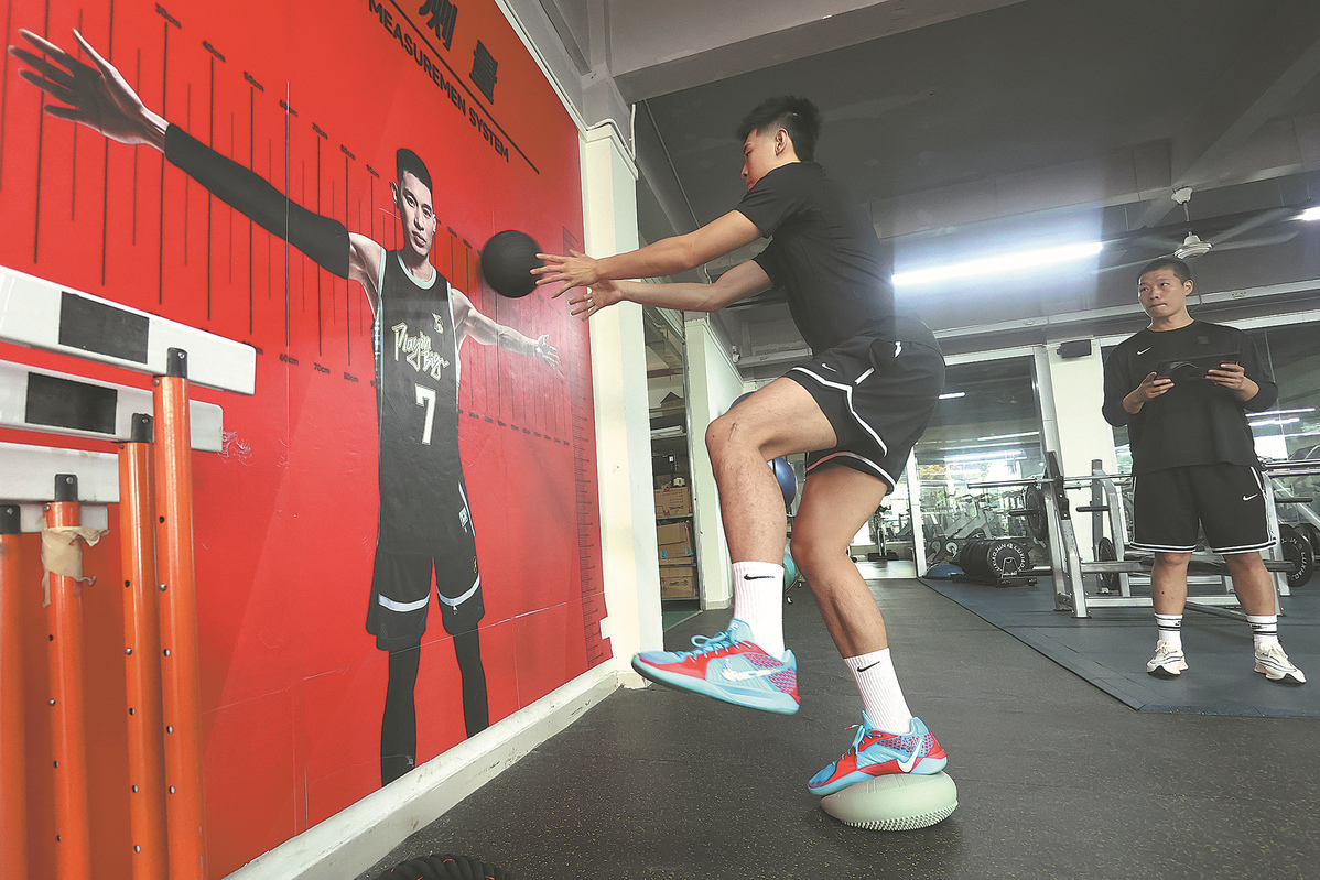 Cui Yongxi trains at Dongguan Basketball School. A mural of ex-NBA player Jeremy Lin serves as motivation for aspiring young players. (WEI XIAOHAO / CHINA DAILY)