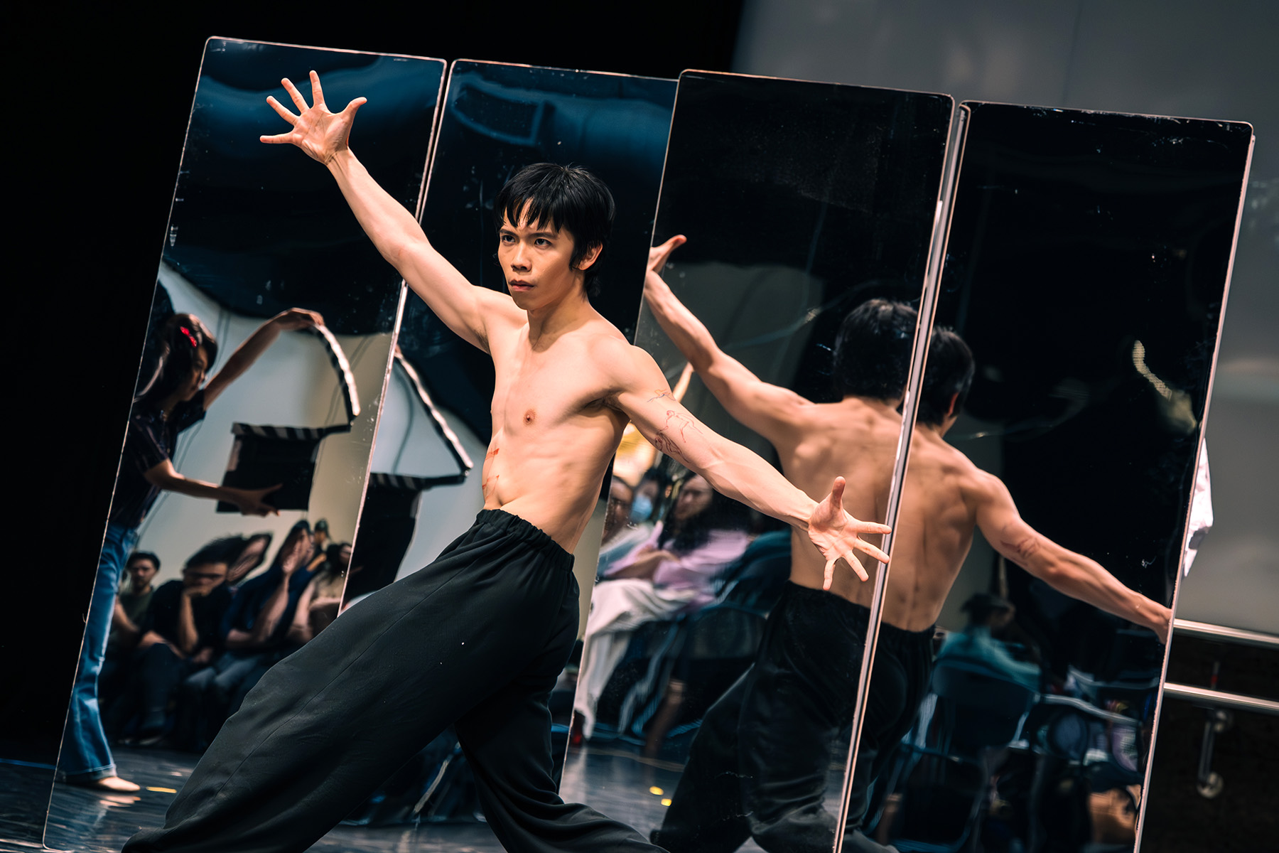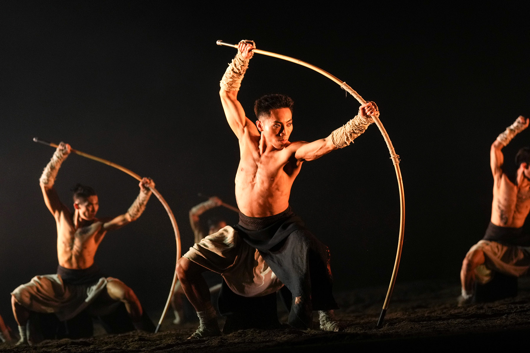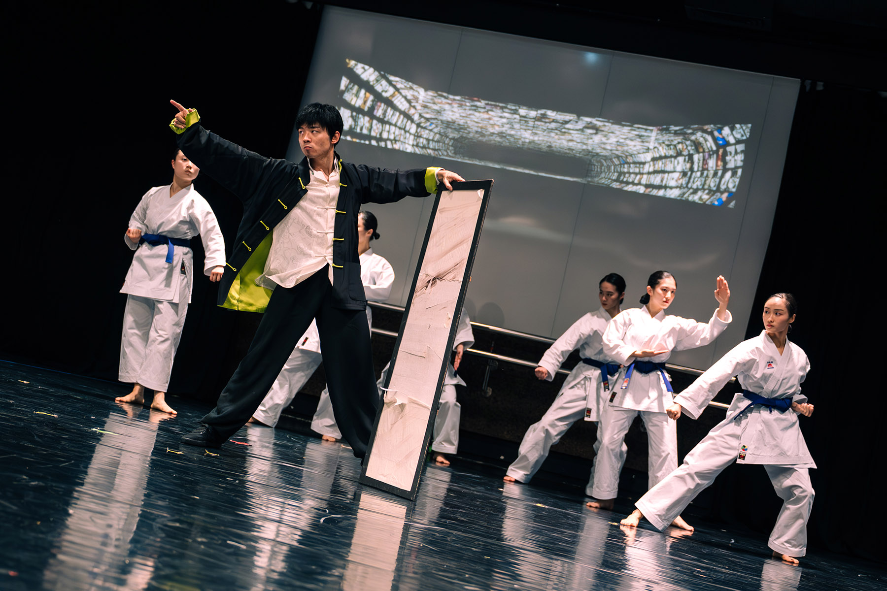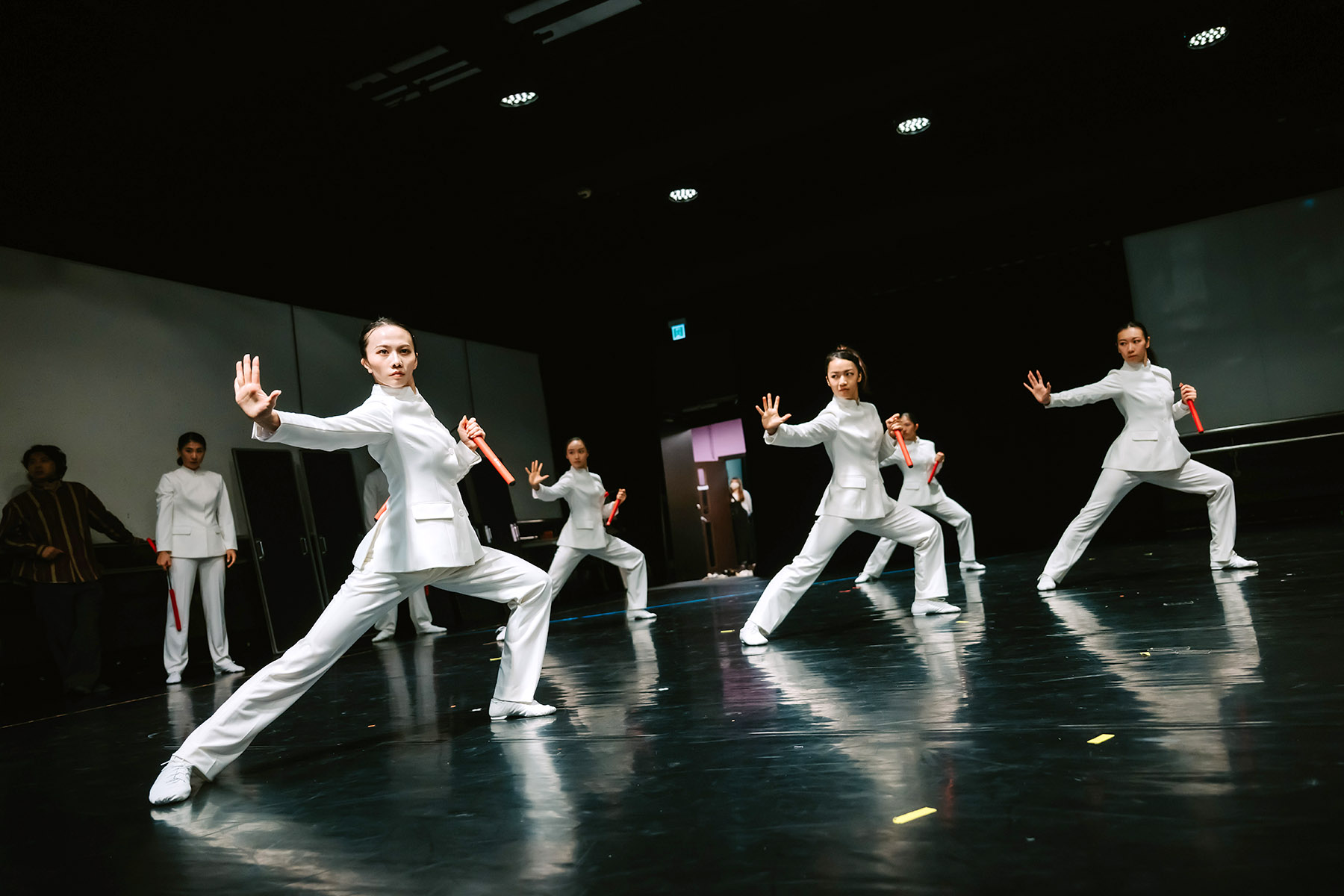 The choreography draws on Jeet Kune Do, karate, and the art of wielding the nunchaku — a traditional Chinese weapon consisting of two wooden sticks connected by a short metal chain. The imagery created on stage resonates with the gracefulness of Cantonese Opera, the vigor of Wing Chun — a form of kung fu involving hand-to-hand combat — and the aesthetic of traditional Chinese ink paintings.