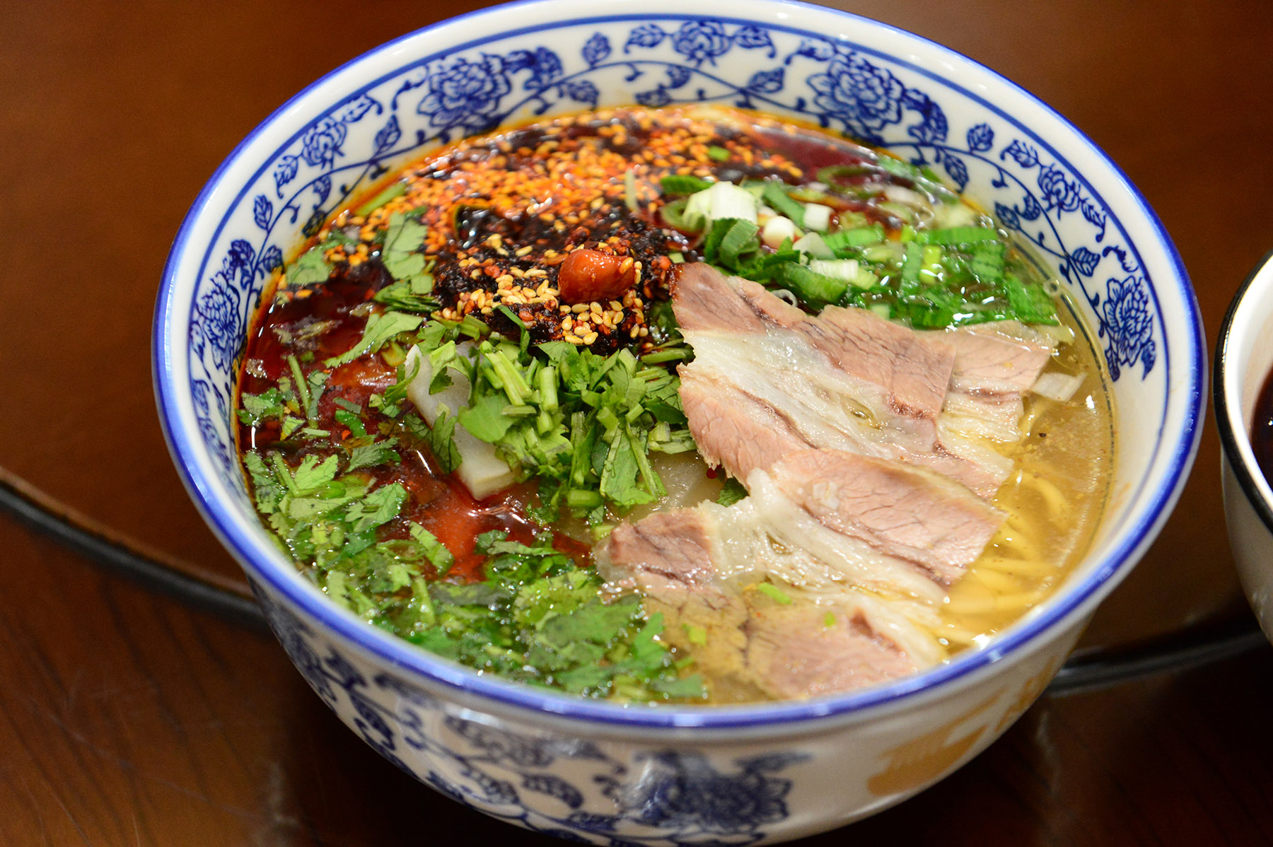 This iconic dish features hand-pulled noodles that are chewy and silky, served in a clear yet rich beef broth that is slow-simmered for hours with spices and radishes. The classic presentation adheres to the principle of "one clear, two white, three red, four green, and five yellow", referring to a clear broth, white radish, red chili oil, green cilantro and scallions, and yellow, shiny noodles.