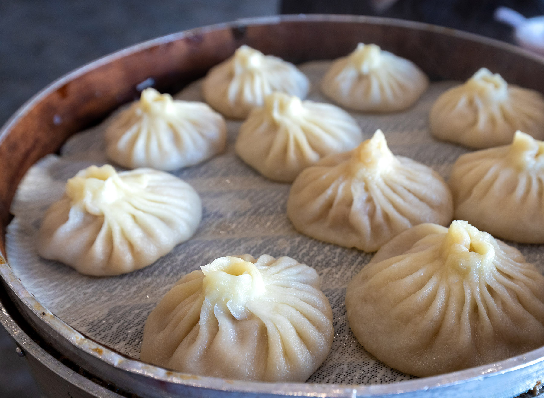 The technique for eating them is crucial: gently lift a dumpling with chopsticks, place it on a spoon, and nibble a small hole in the side to sip the hot soup first — this avoids burns to the mouth from a sudden burst of hot soup. Dip the remaining dumpling in vinegar or a touch of shredded ginger to balance its richness.