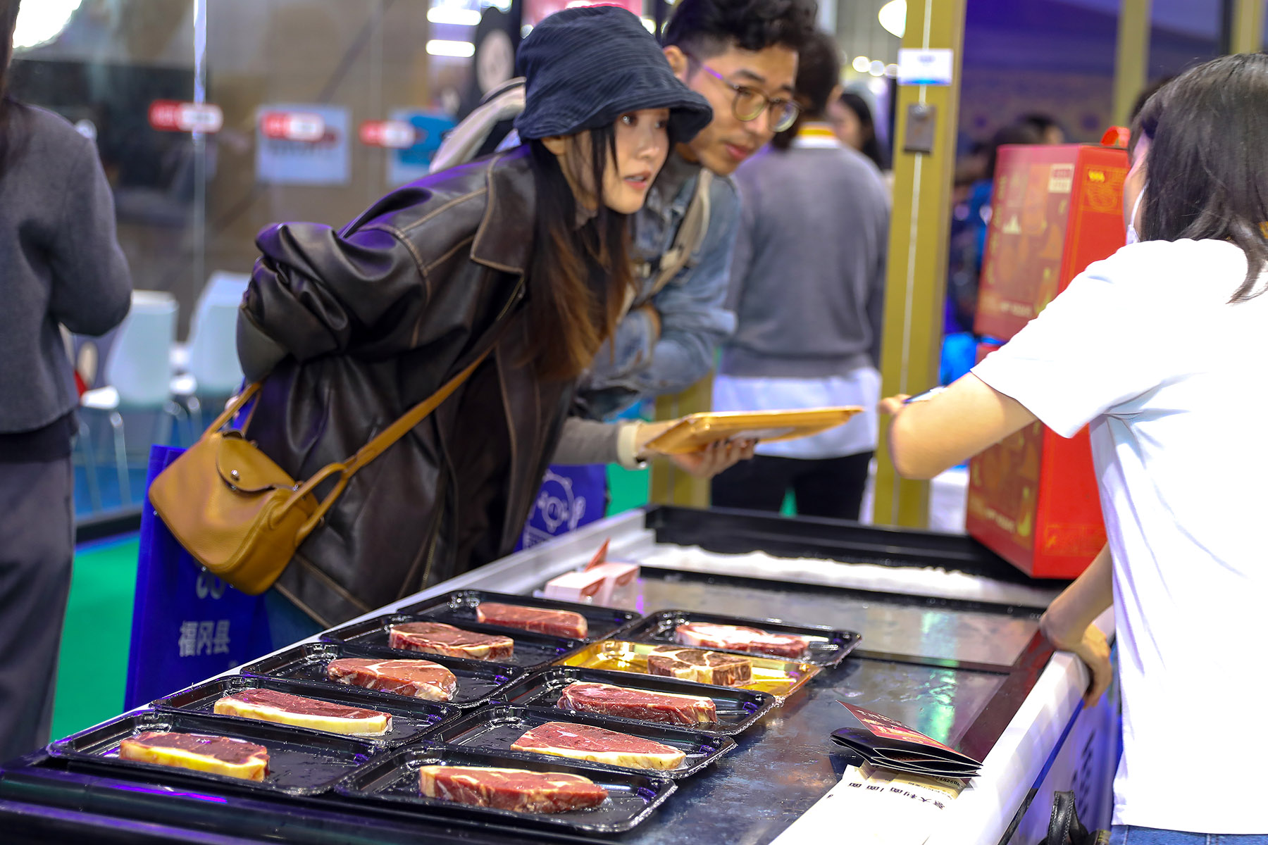 A visitor shows interest in beef imported from New Zealand at the 8th China International Import Expo in Shanghai. (PROVIDED TO CHINA DAILY)