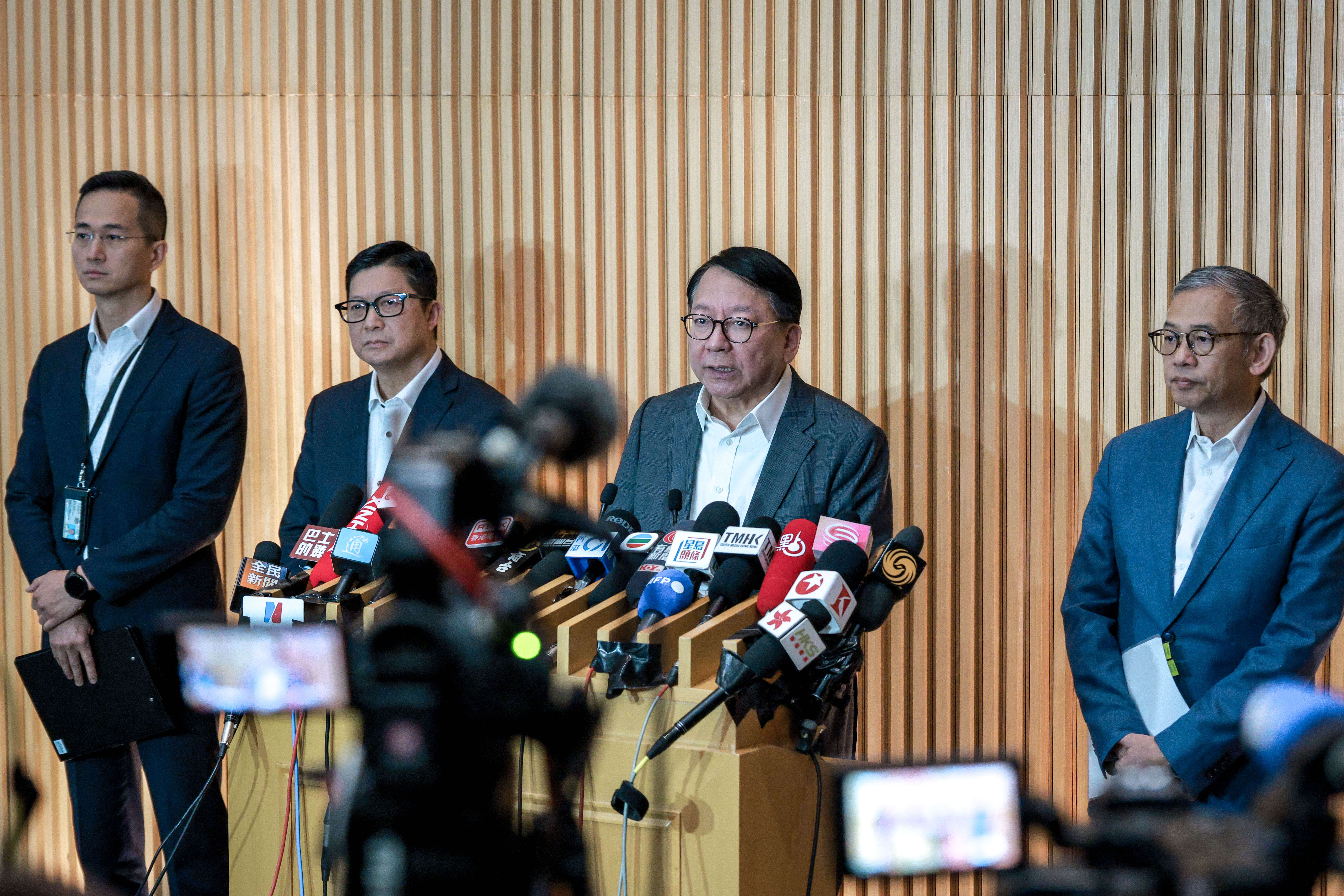 Hong Kong Chief Secretary for Administration Chan Kwok-ki (third left), flanked by Hong Kong Secretary for Security Tang Ping-keung (second left), Director of Crime and Security of the Hong Kong Police Force Chan Tung (left) and ICAC Commissioner Woo Ying-ming (right), briefs the media on the follow-up investigation into the deadly No 5 alarm fire at Wang Fuk Court in Tai Po, at the Central Government Offices in Tamar on Dec 1, 2025. (ANDY CHONG / CHINA DAILY)